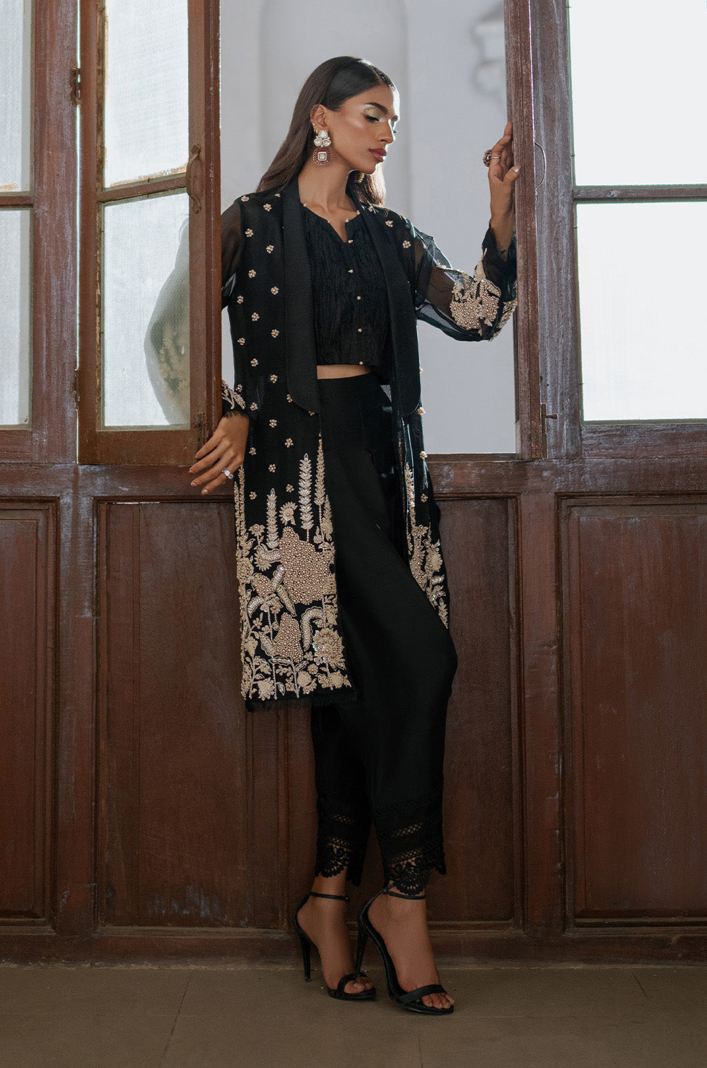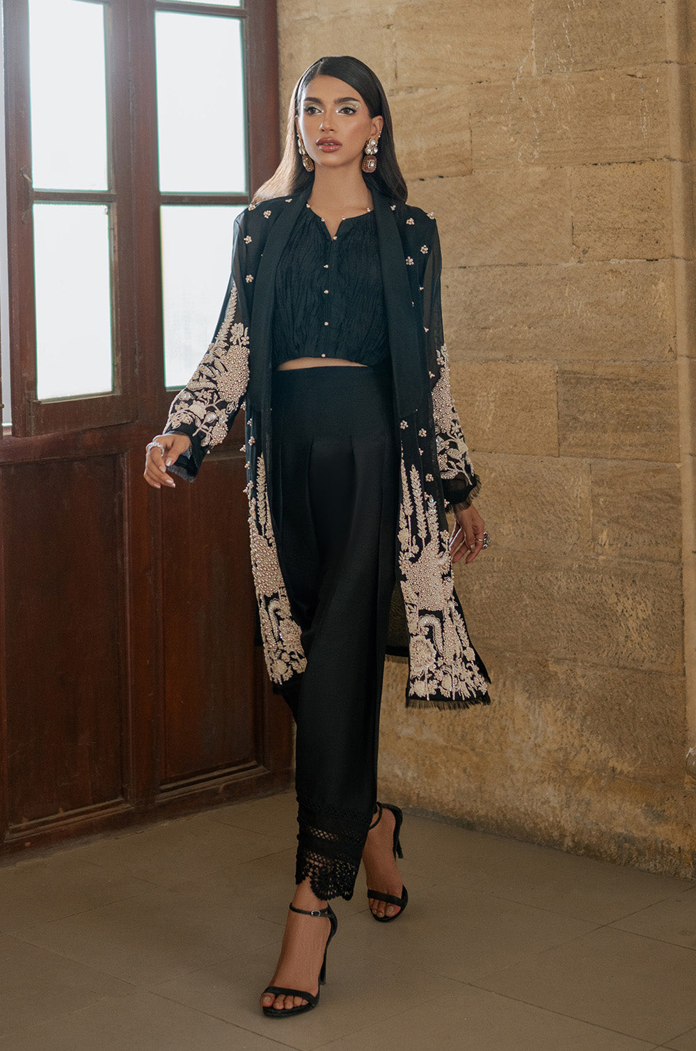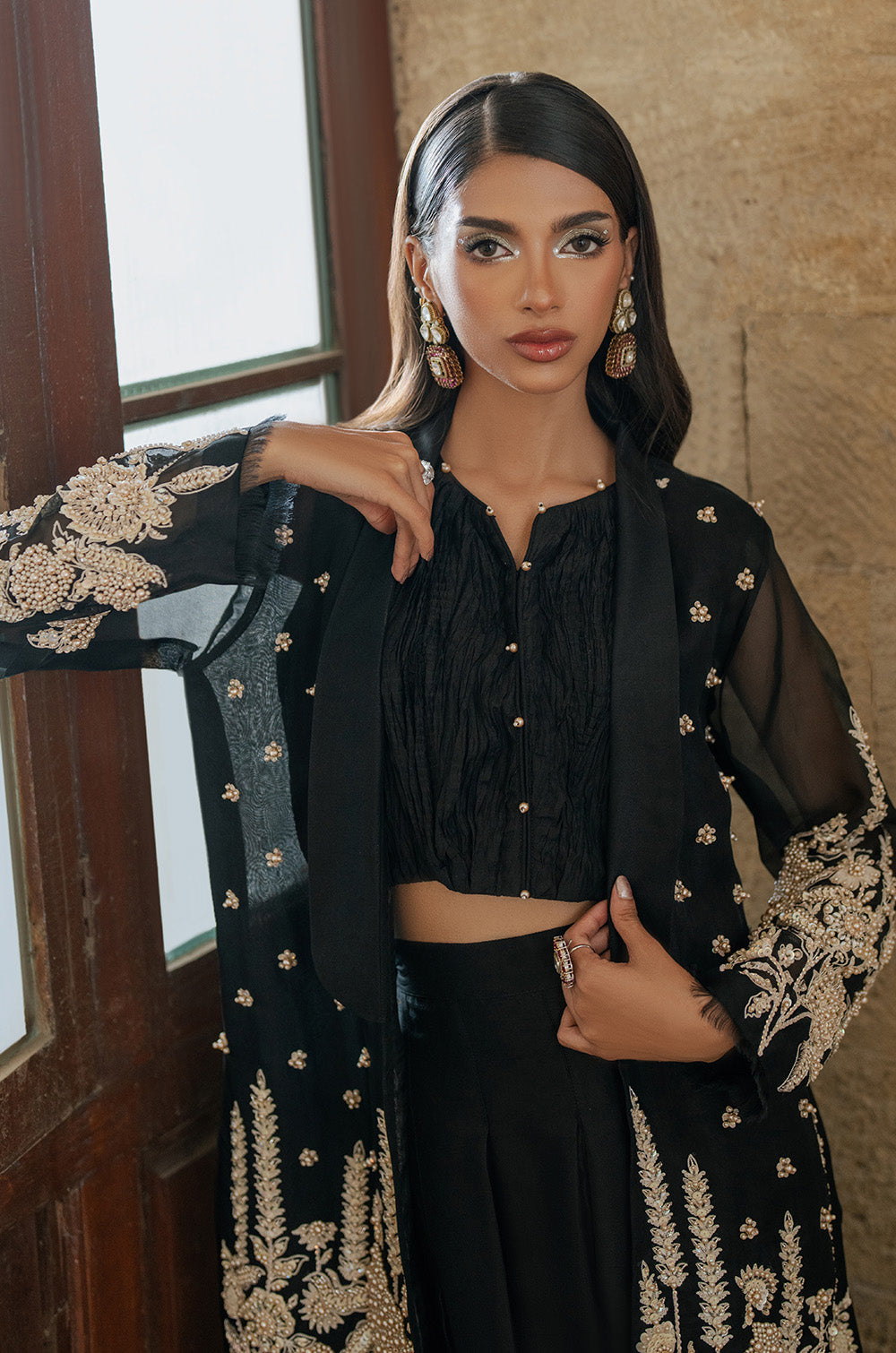 Pure black organza jacket with heavy intricate work on front panels and sleeves. Handwork heavy bootis all over jacket gives additional classy touch to the whole apparel. This jacket is paired with a crushed crop top and shalwar finished with lace.