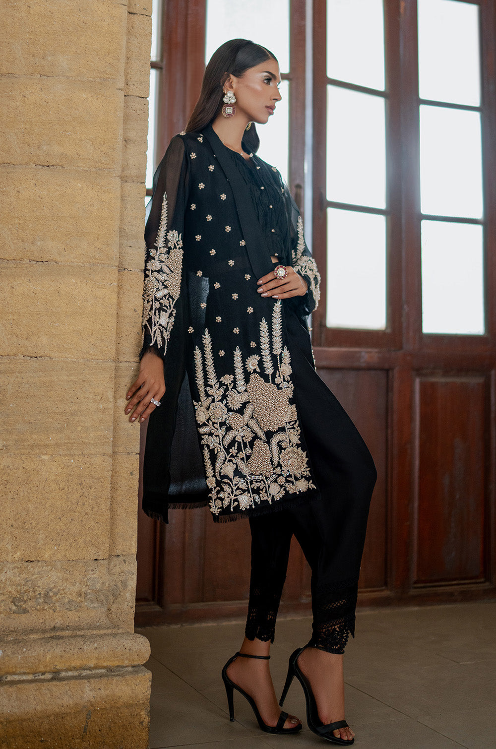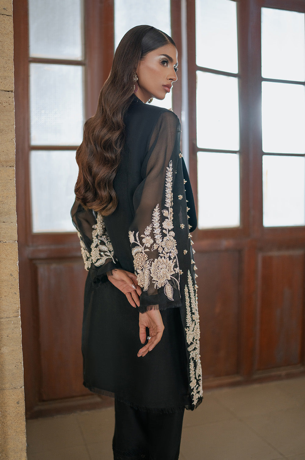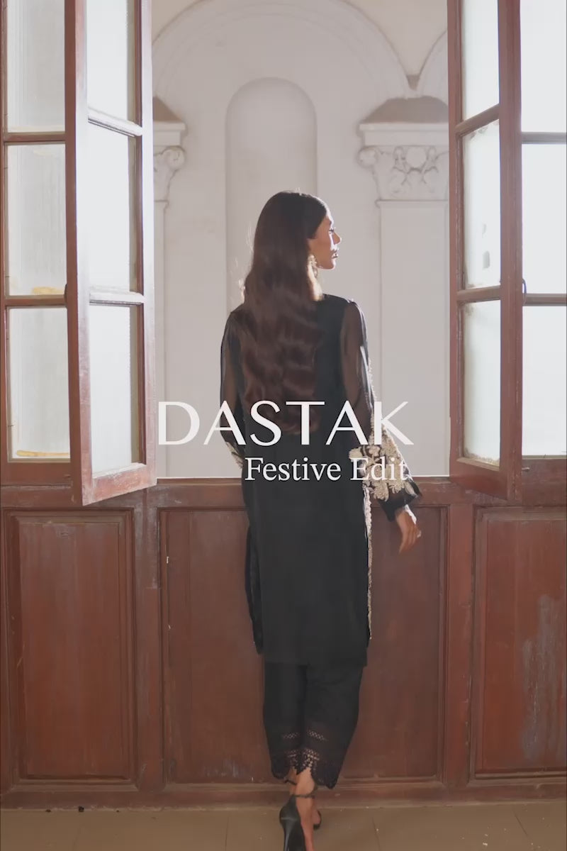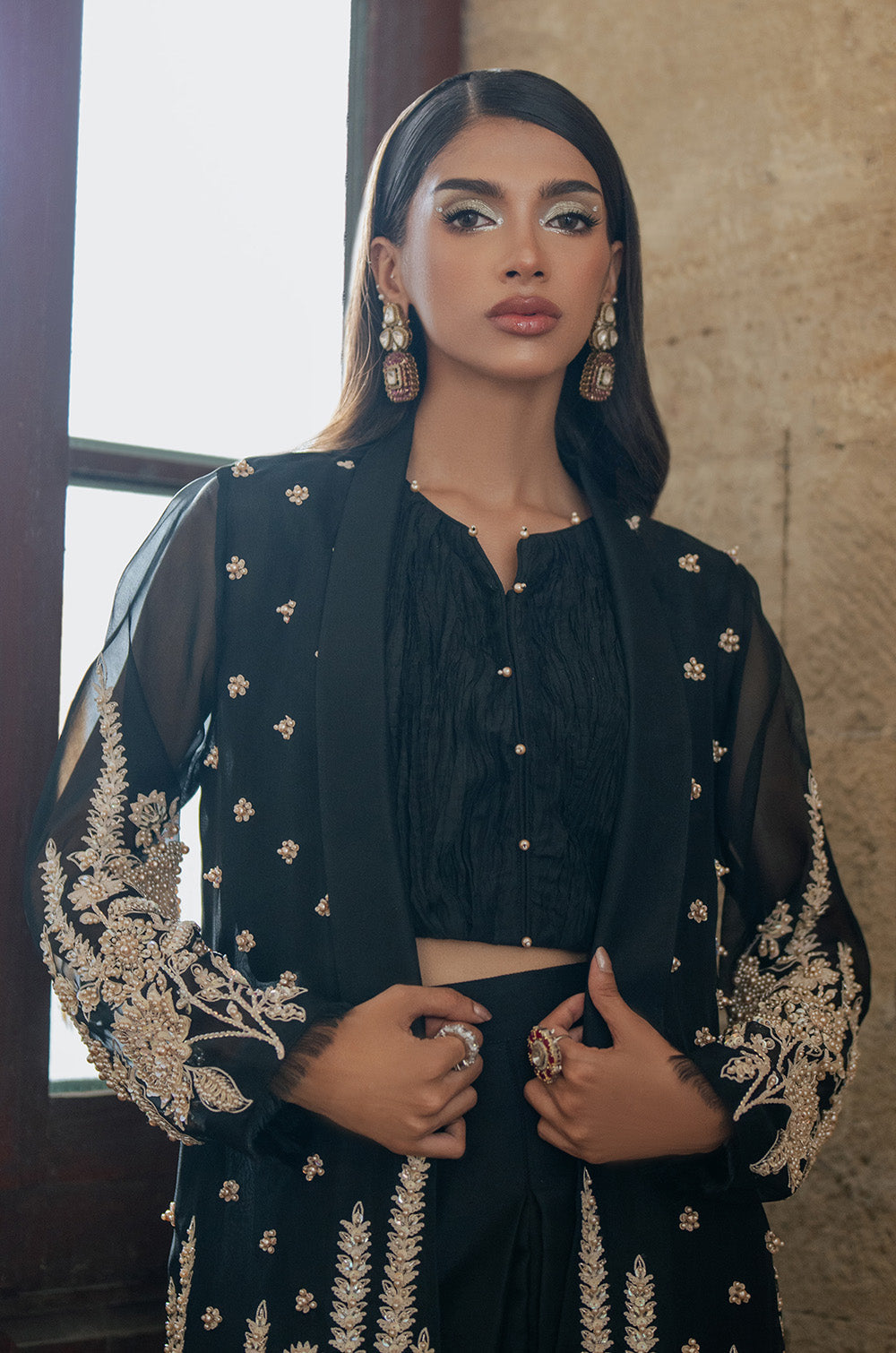 Pure black organza jacket with heavy intricate work on front panels and sleeves. Handwork heavy bootis all over jacket gives additional classy touch to the whole apparel. This jacket is paired with a crushed crop top and shalwar finished with lace.