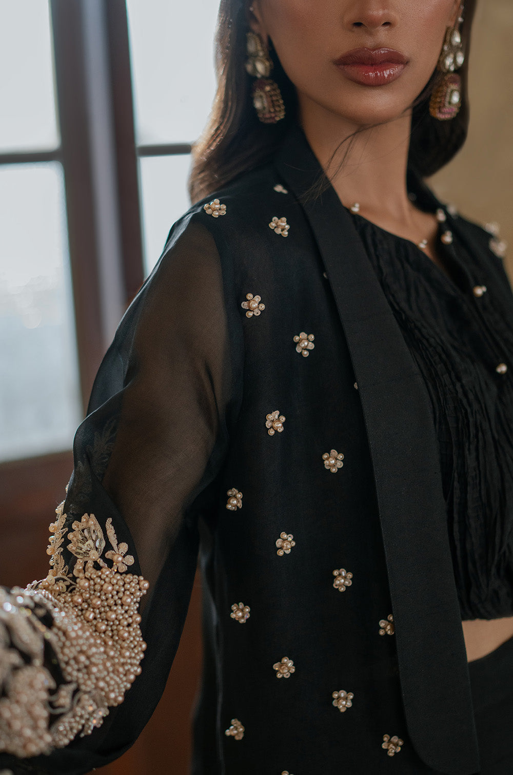 Pure black organza jacket with heavy intricate work on front panels and sleeves. Handwork heavy bootis all over jacket gives...