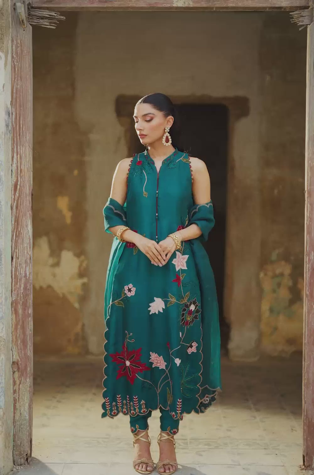 Enhance your style with this stunning dark teal green raw silk A-line shirt, featuring intricate floral appliqué embroidery in multiple...