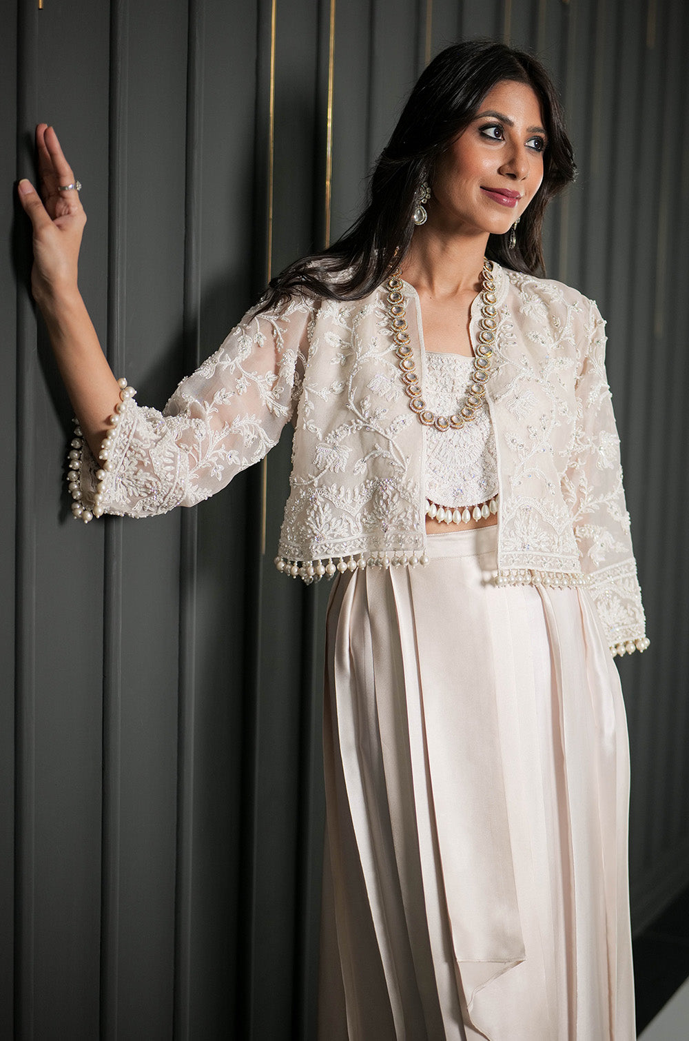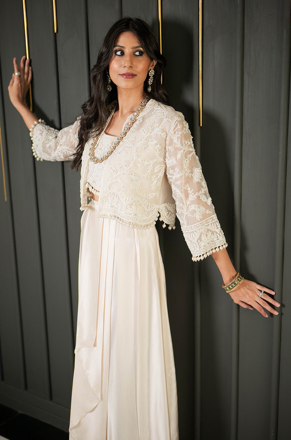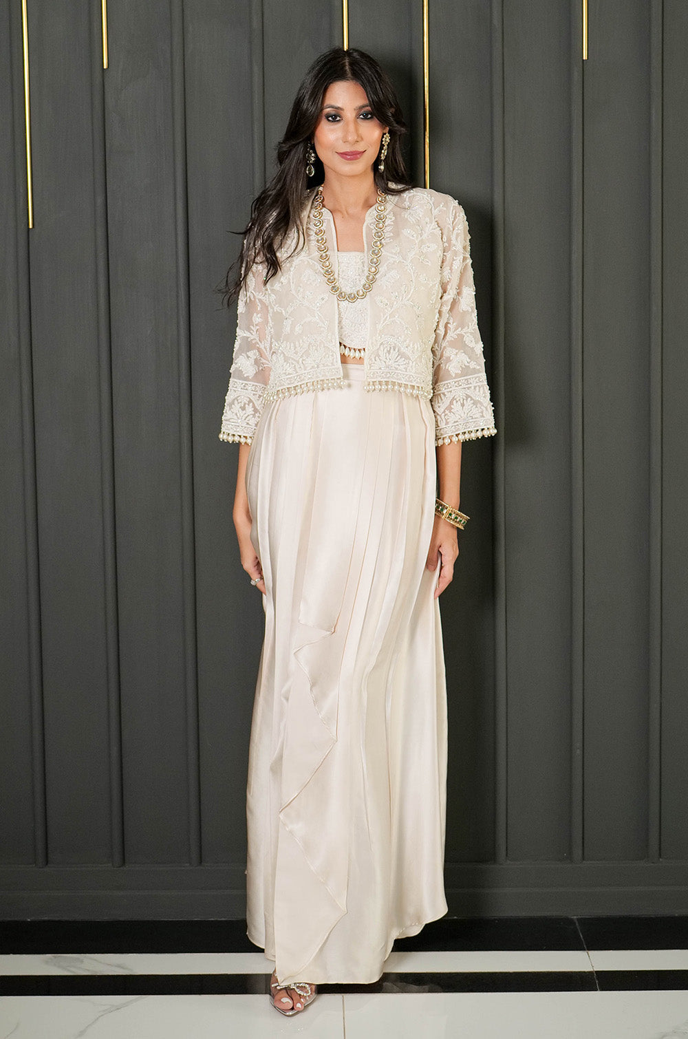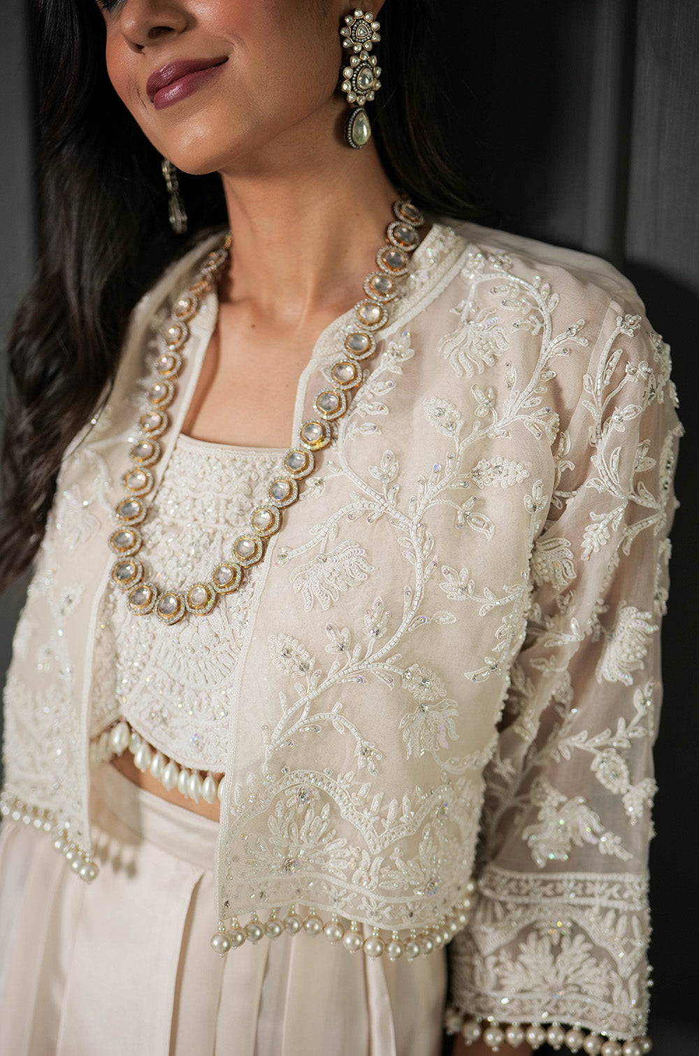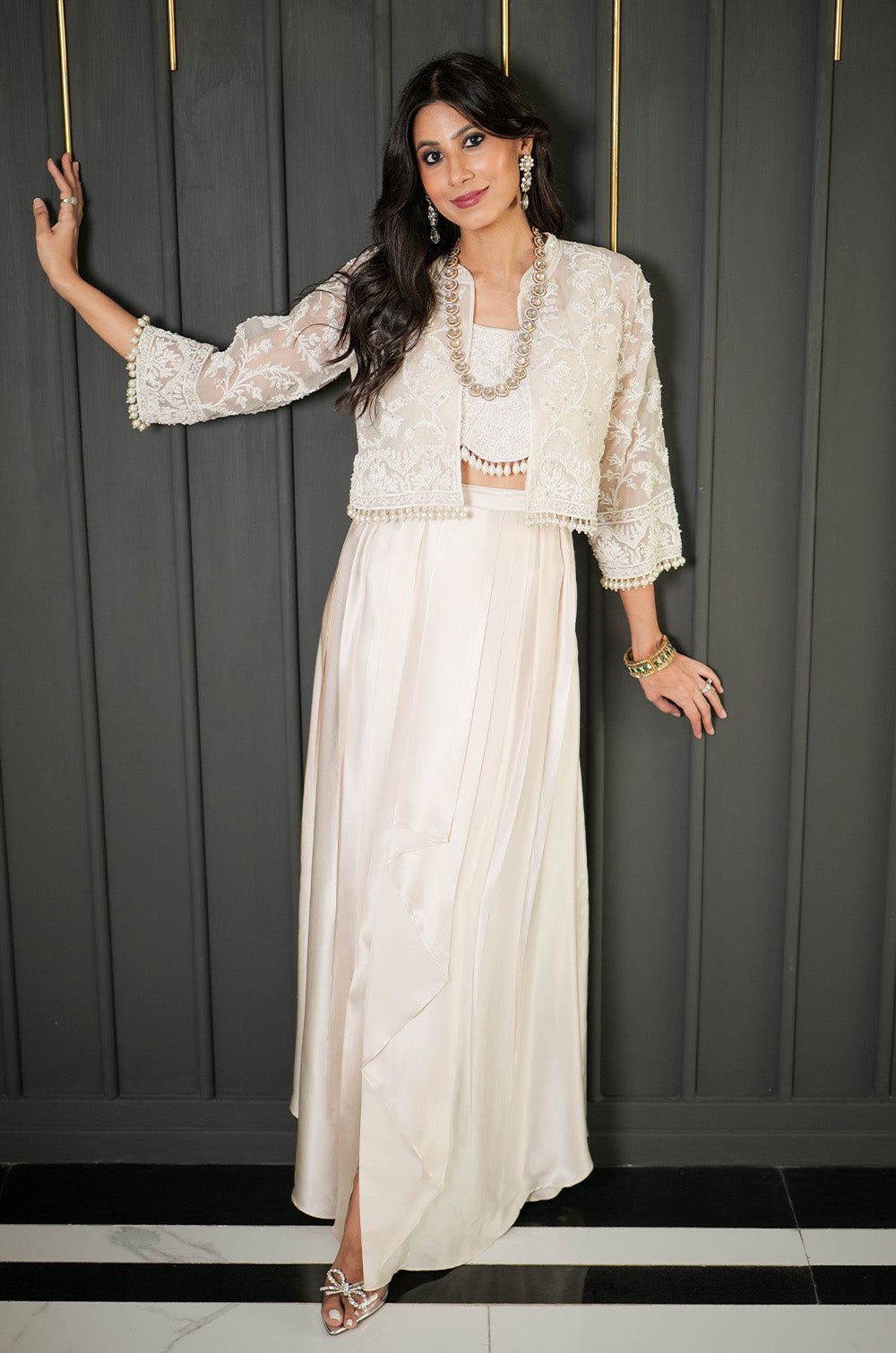 A captivating fusion of sophistication. Beautiful pure organza cropped jacket in ivory color with intricate hand work all over in self. Paired with a fully worked bodice on pure raw silk and sarong skirt.