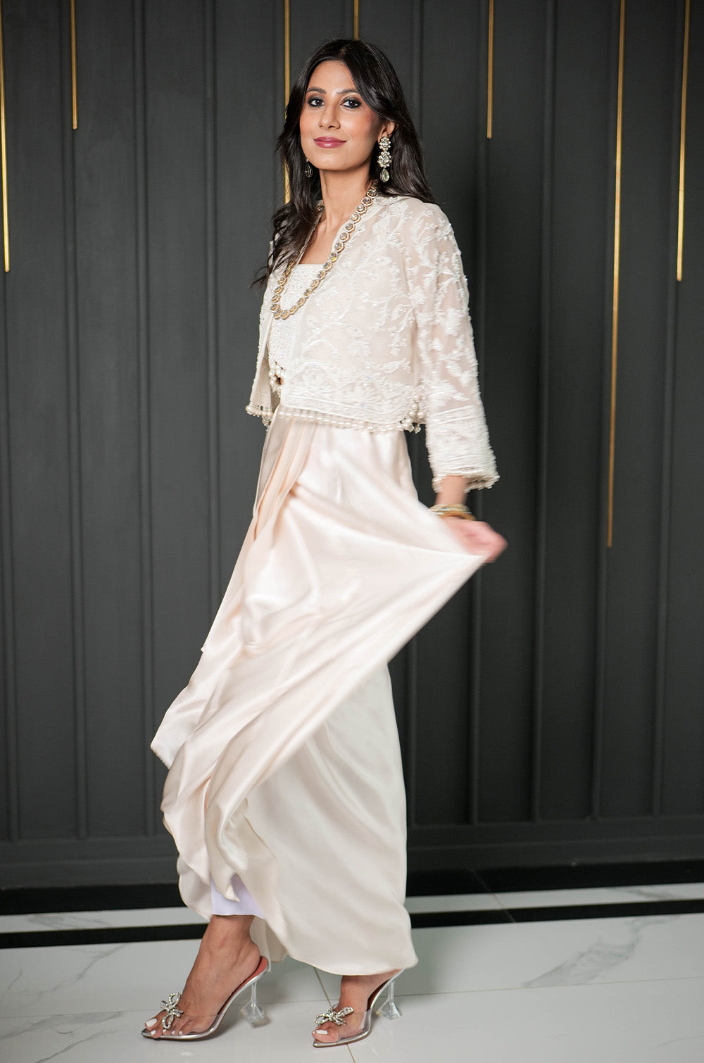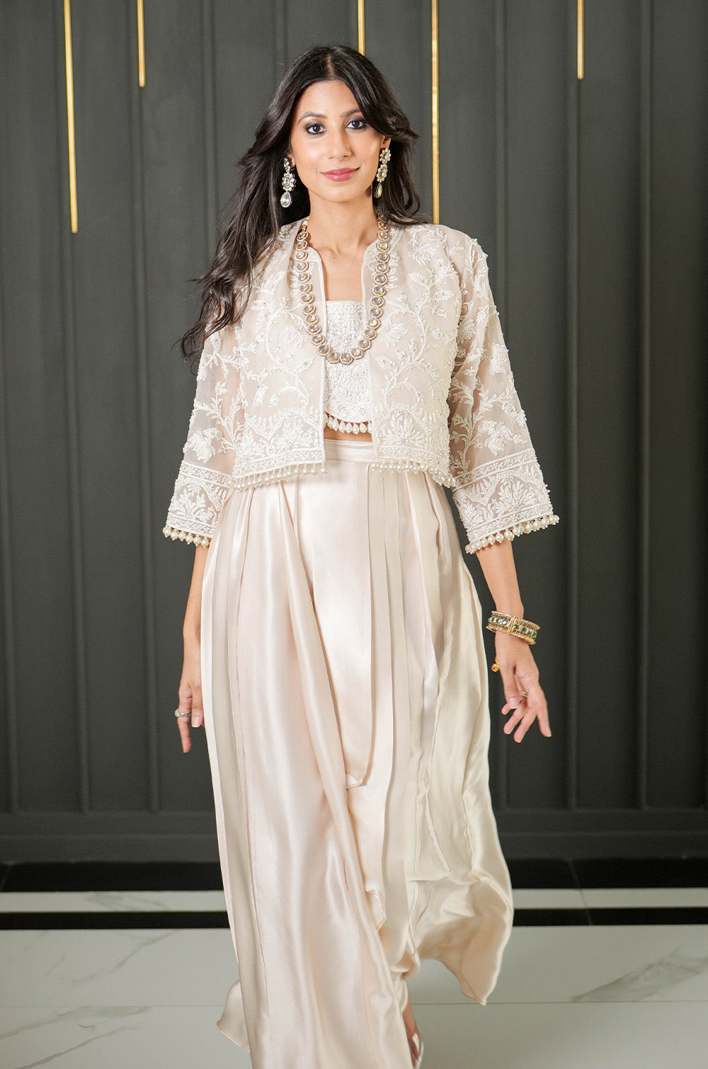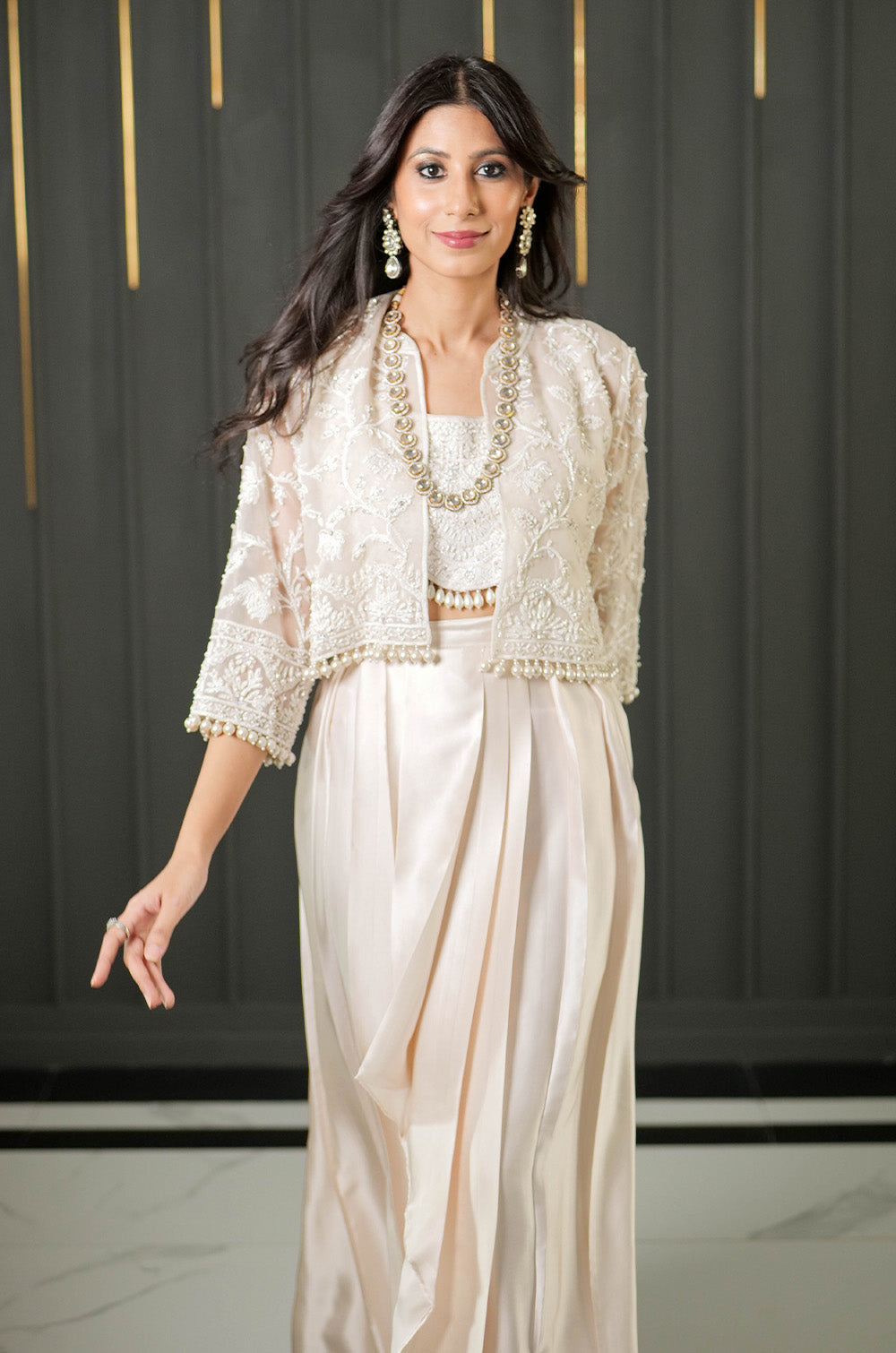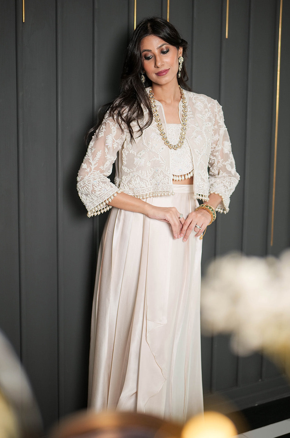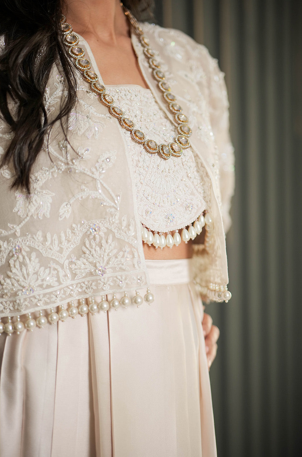 A captivating fusion of sophistication. Beautiful pure organza cropped jacket in ivory color with intricate hand work all over in self. Paired with a fully worked bodice on pure raw silk and sarong skirt.