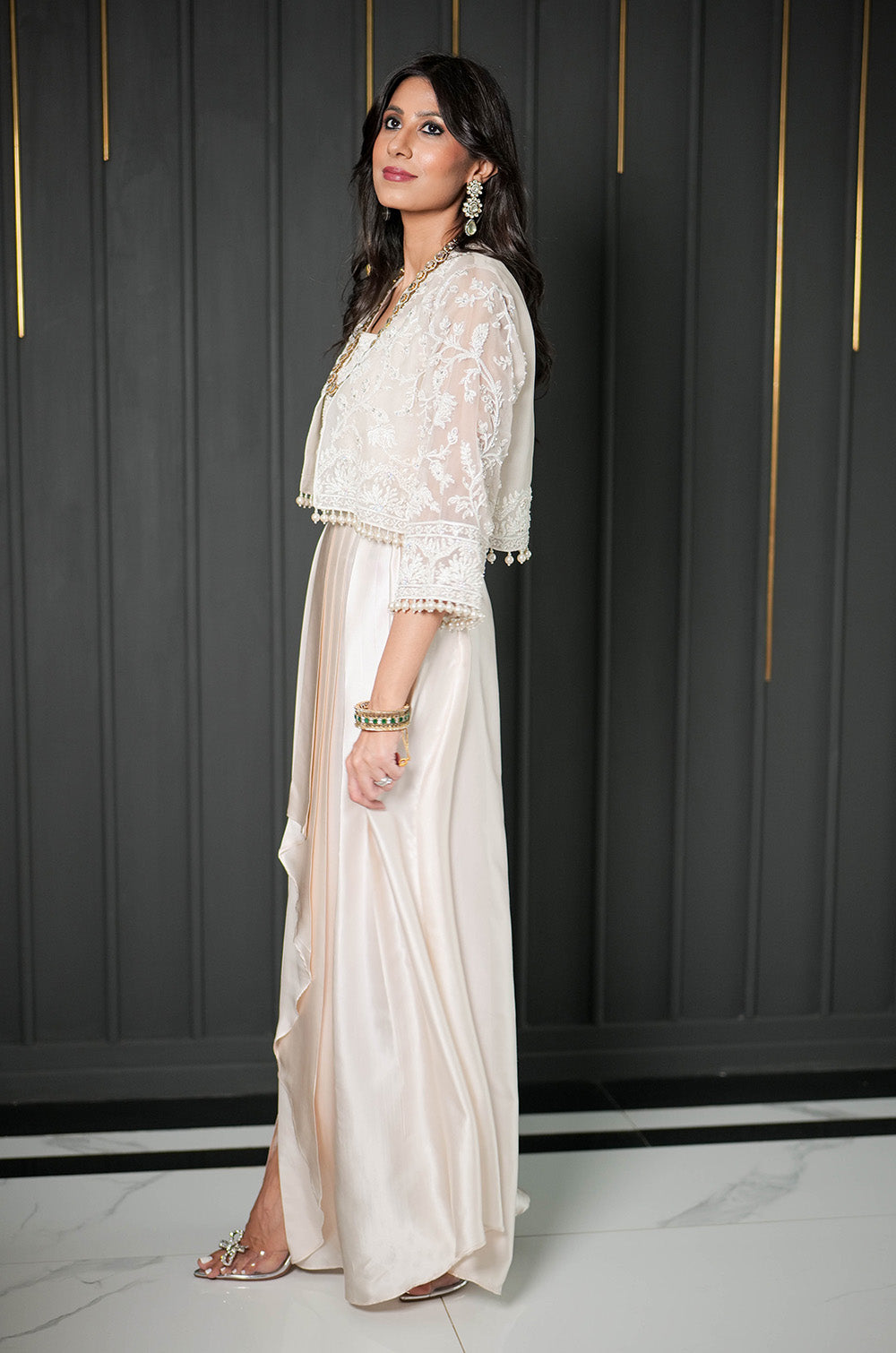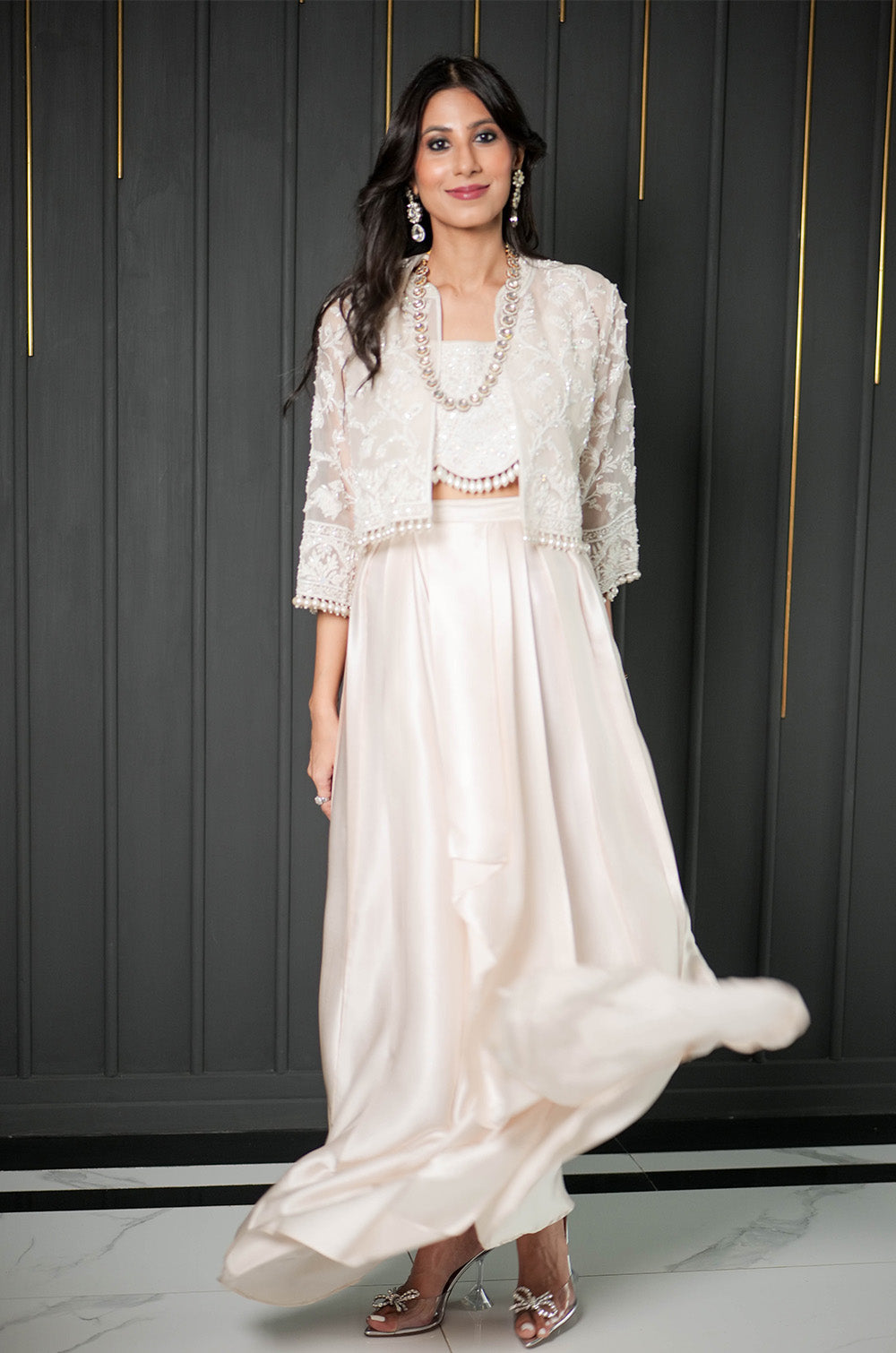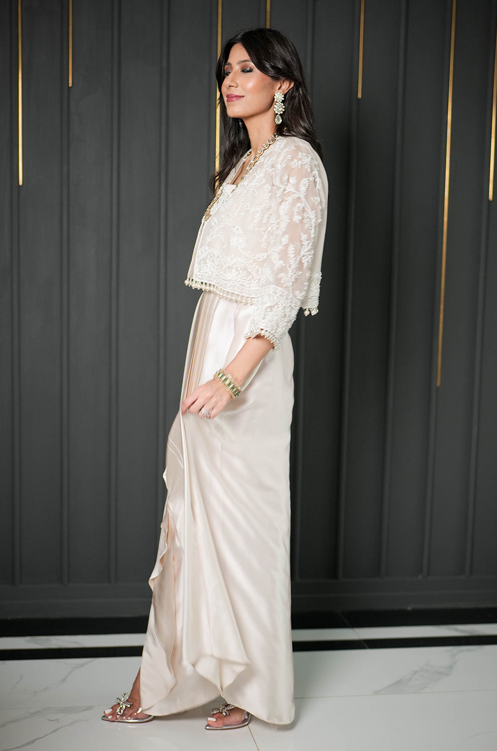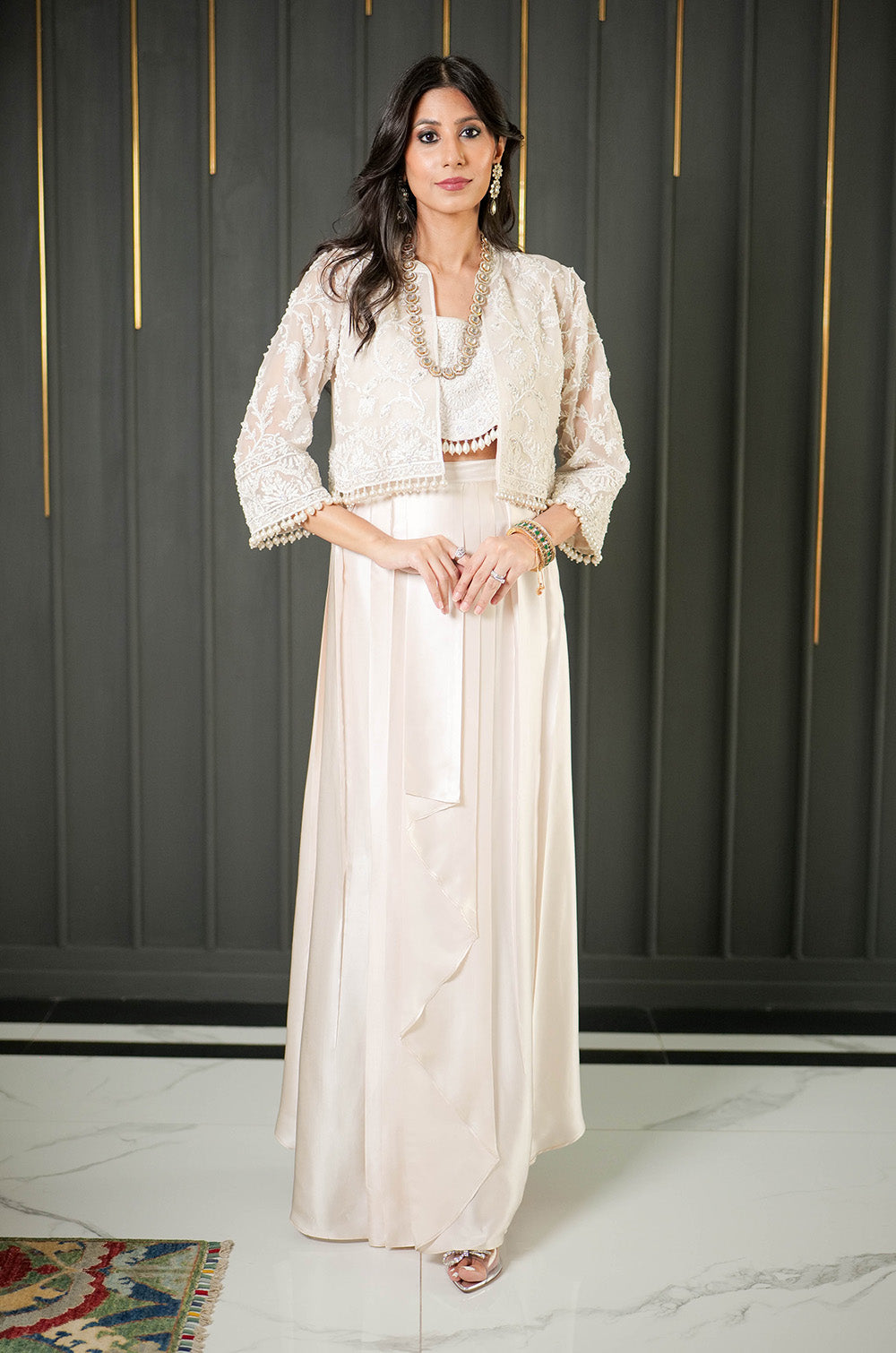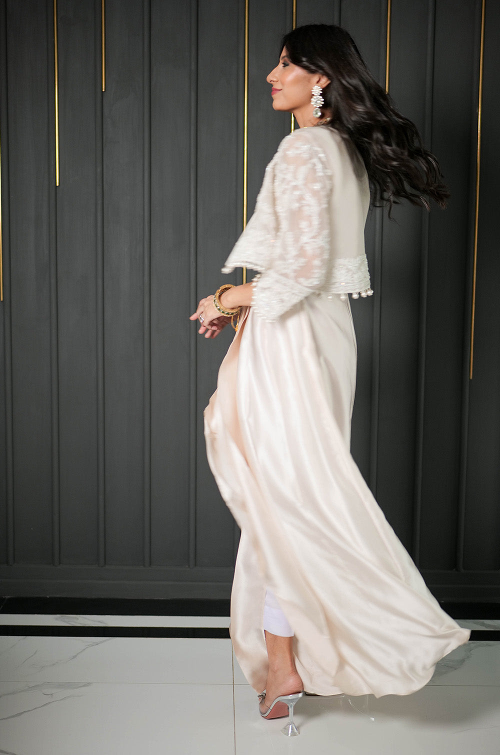 A captivating fusion of sophistication. Beautiful pure organza cropped jacket in ivory color with intricate hand work all over in self. Paired with a fully worked bodice on pure raw silk and sarong skirt.
