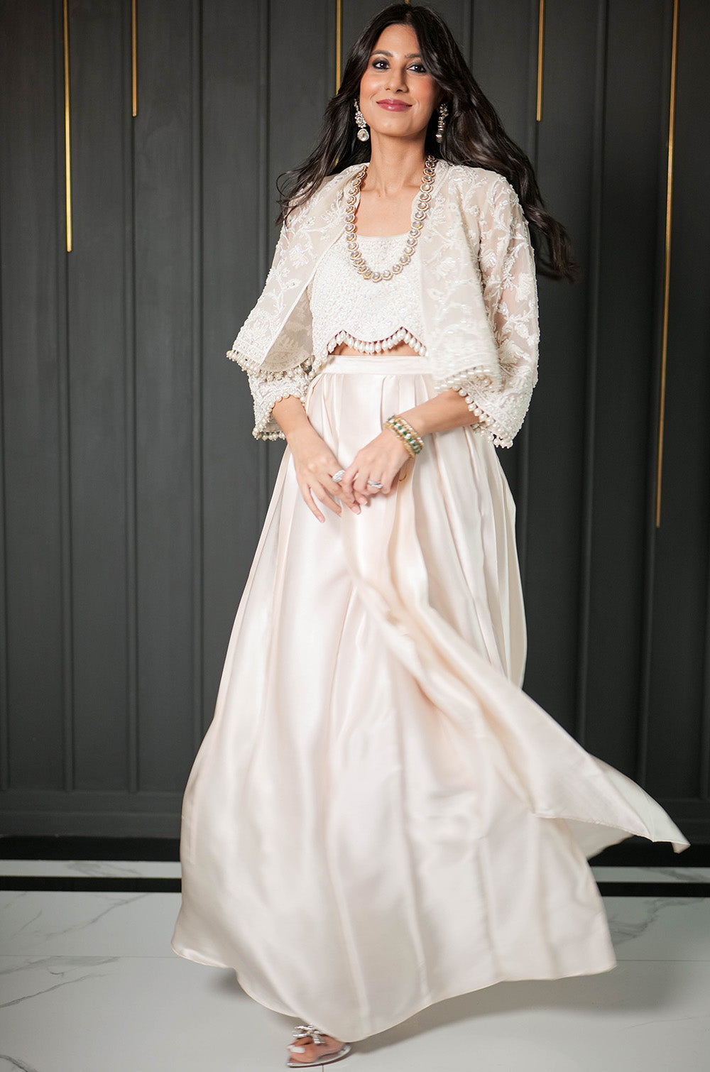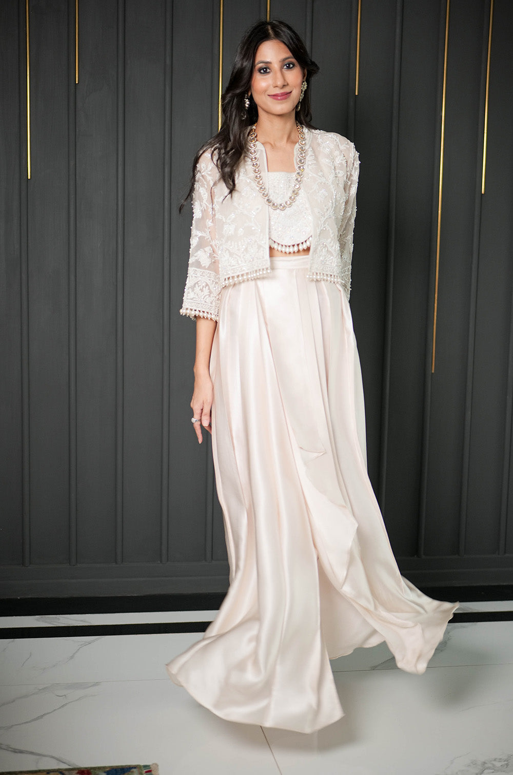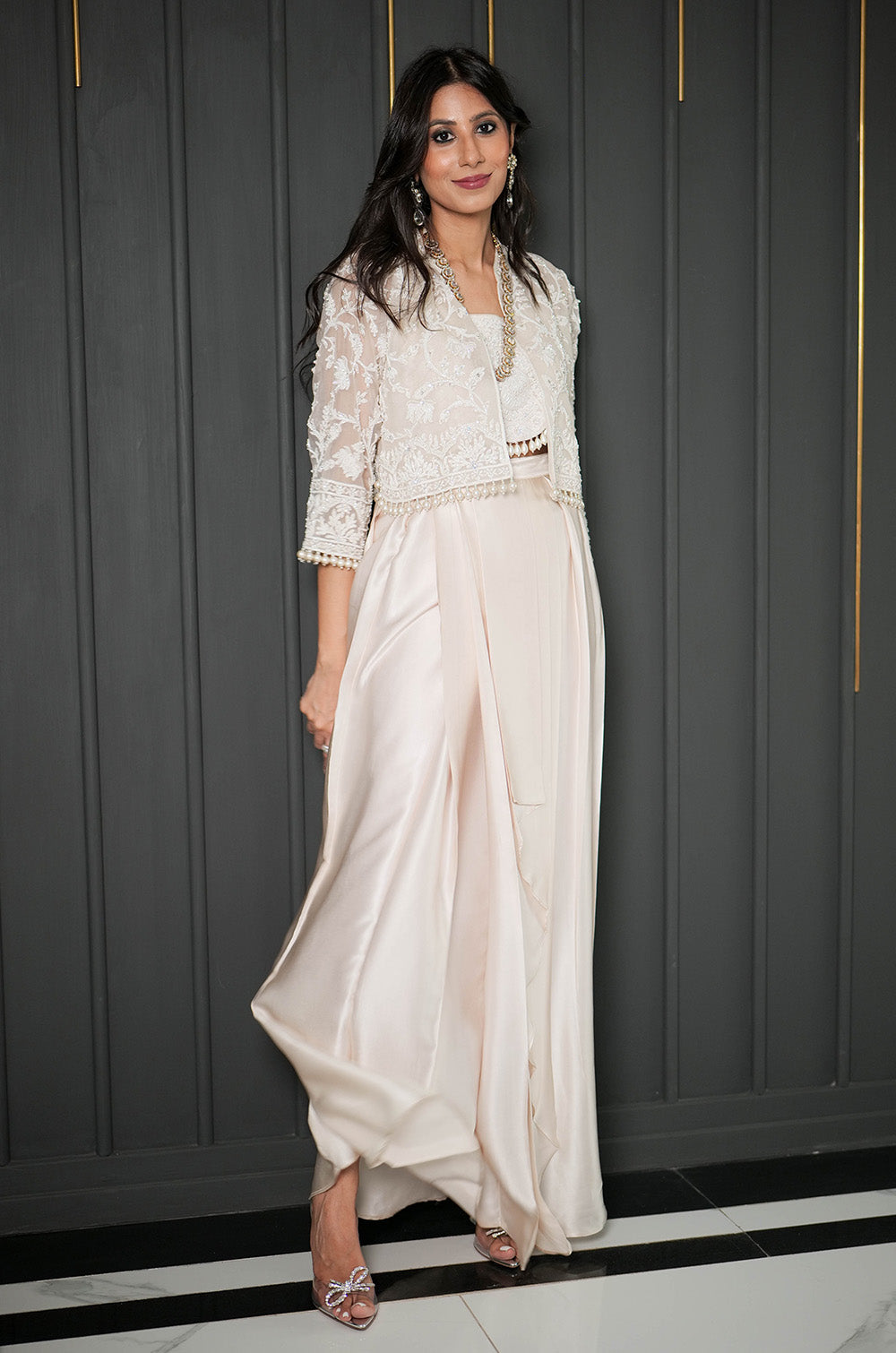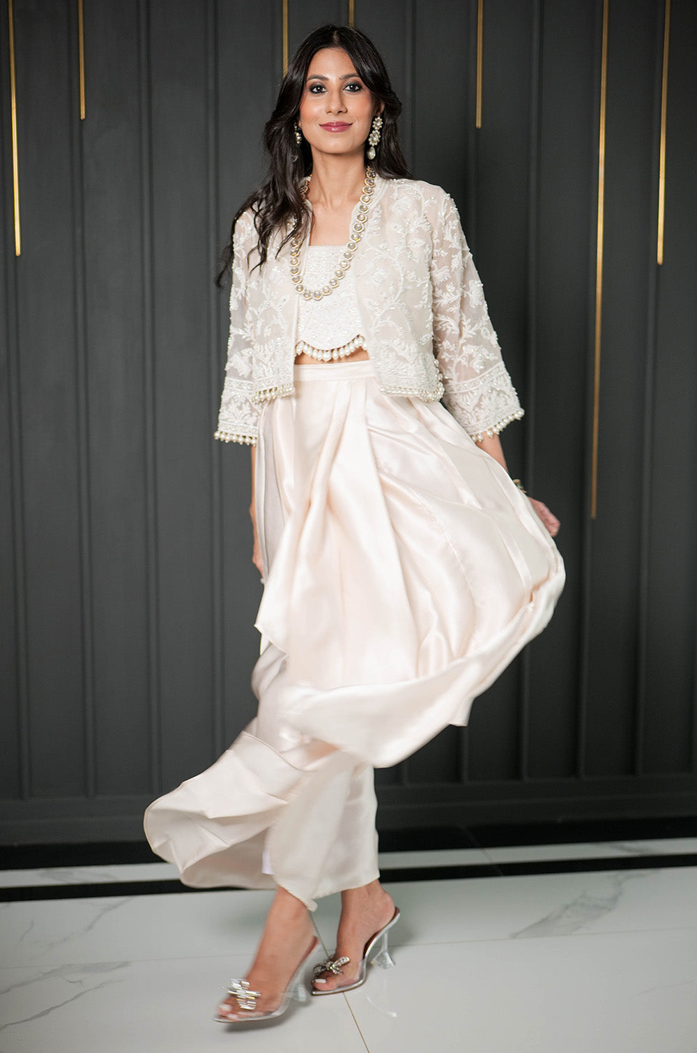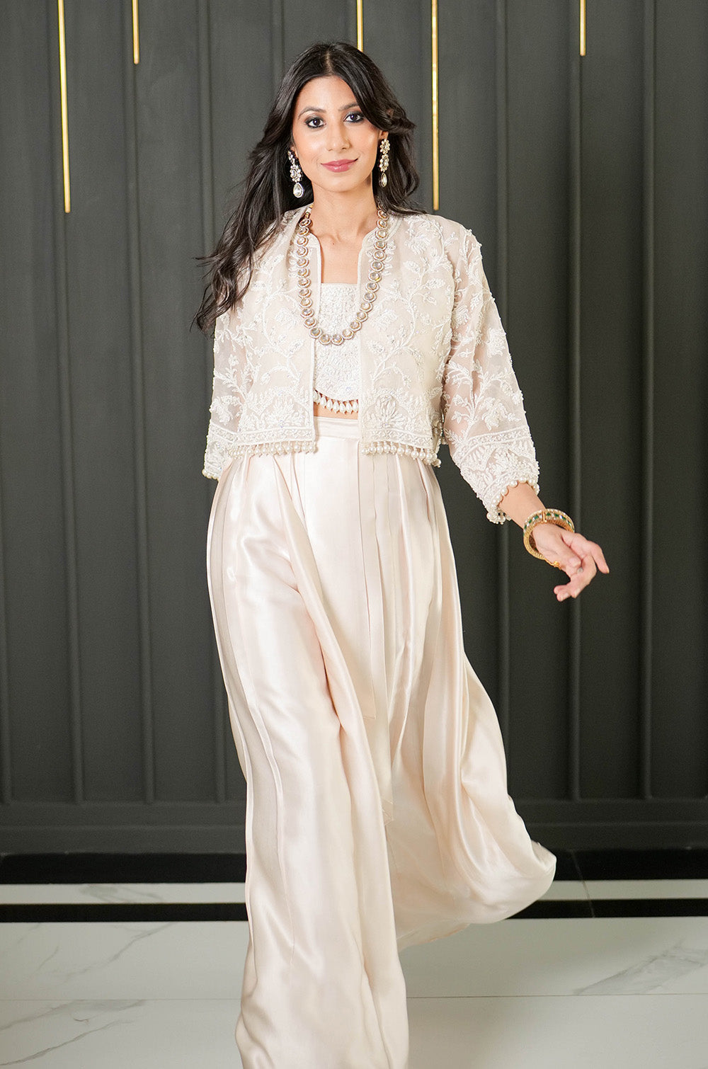 A captivating fusion of sophistication. Beautiful pure organza cropped jacket in ivory color with intricate hand work all over in self. Paired with a fully worked bodice on pure raw silk and sarong skirt.