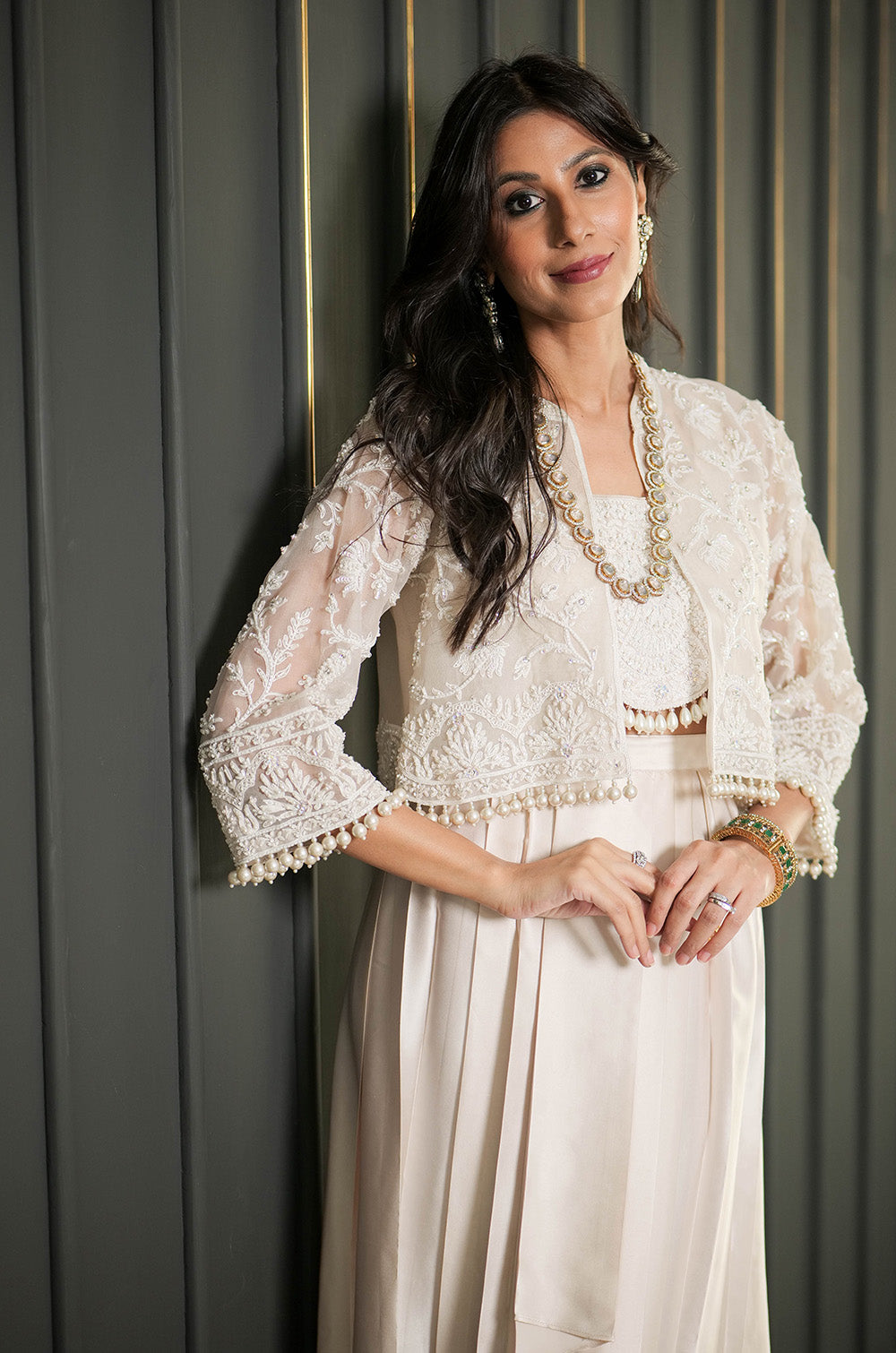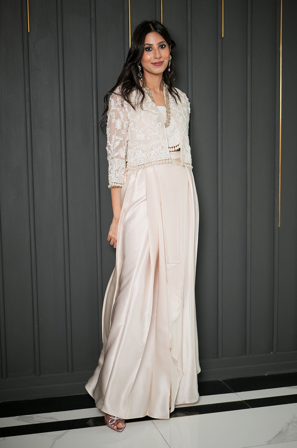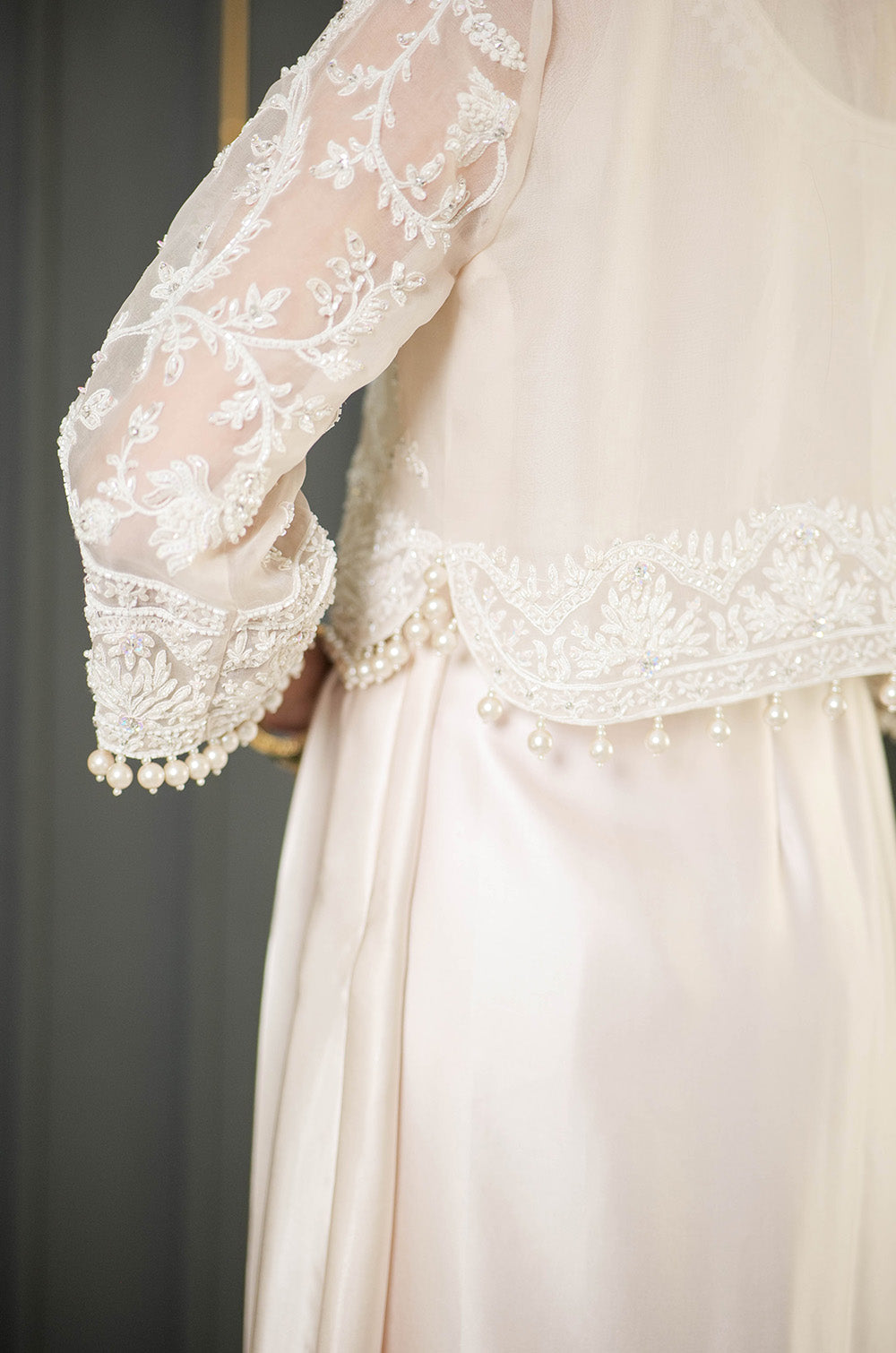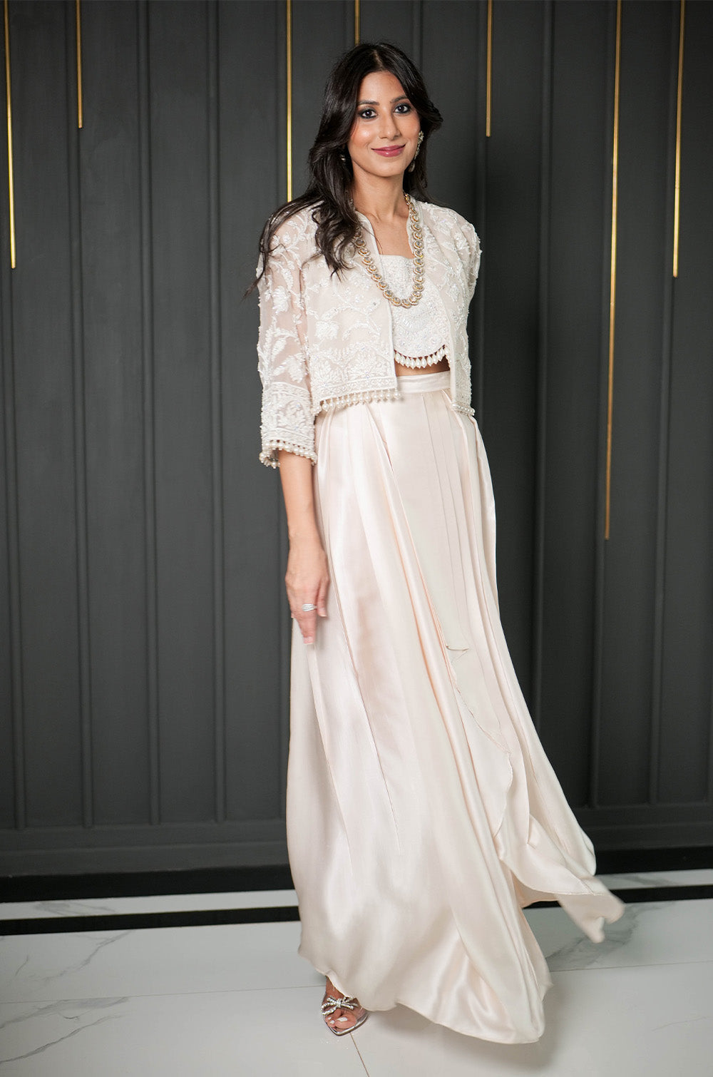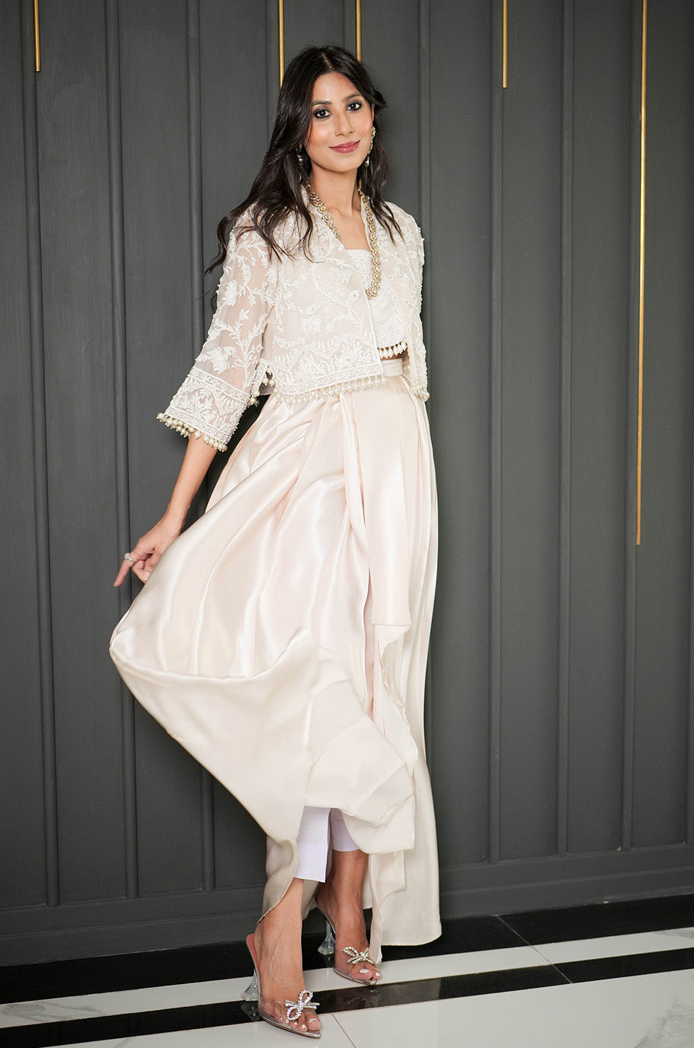 A captivating fusion of sophistication. Beautiful pure organza cropped jacket in ivory color with intricate hand work all over in self. Paired with a fully worked bodice on pure raw silk and sarong skirt.