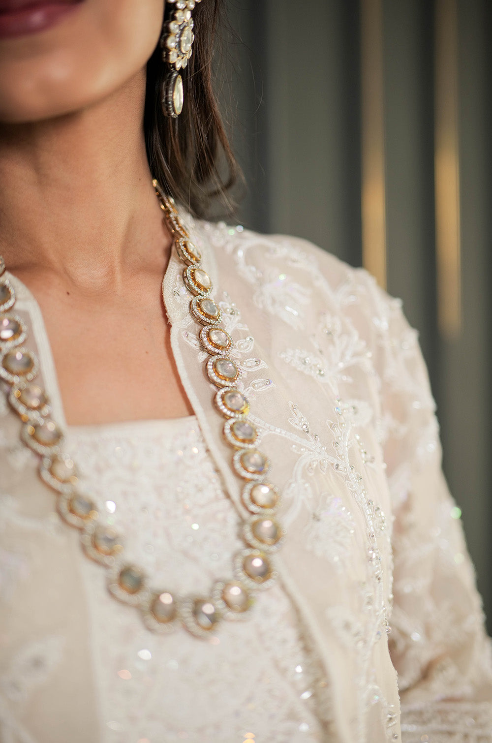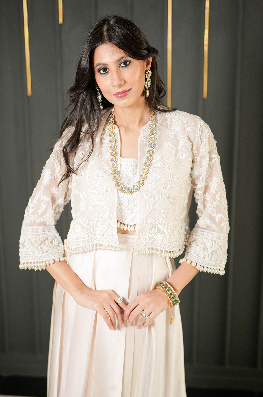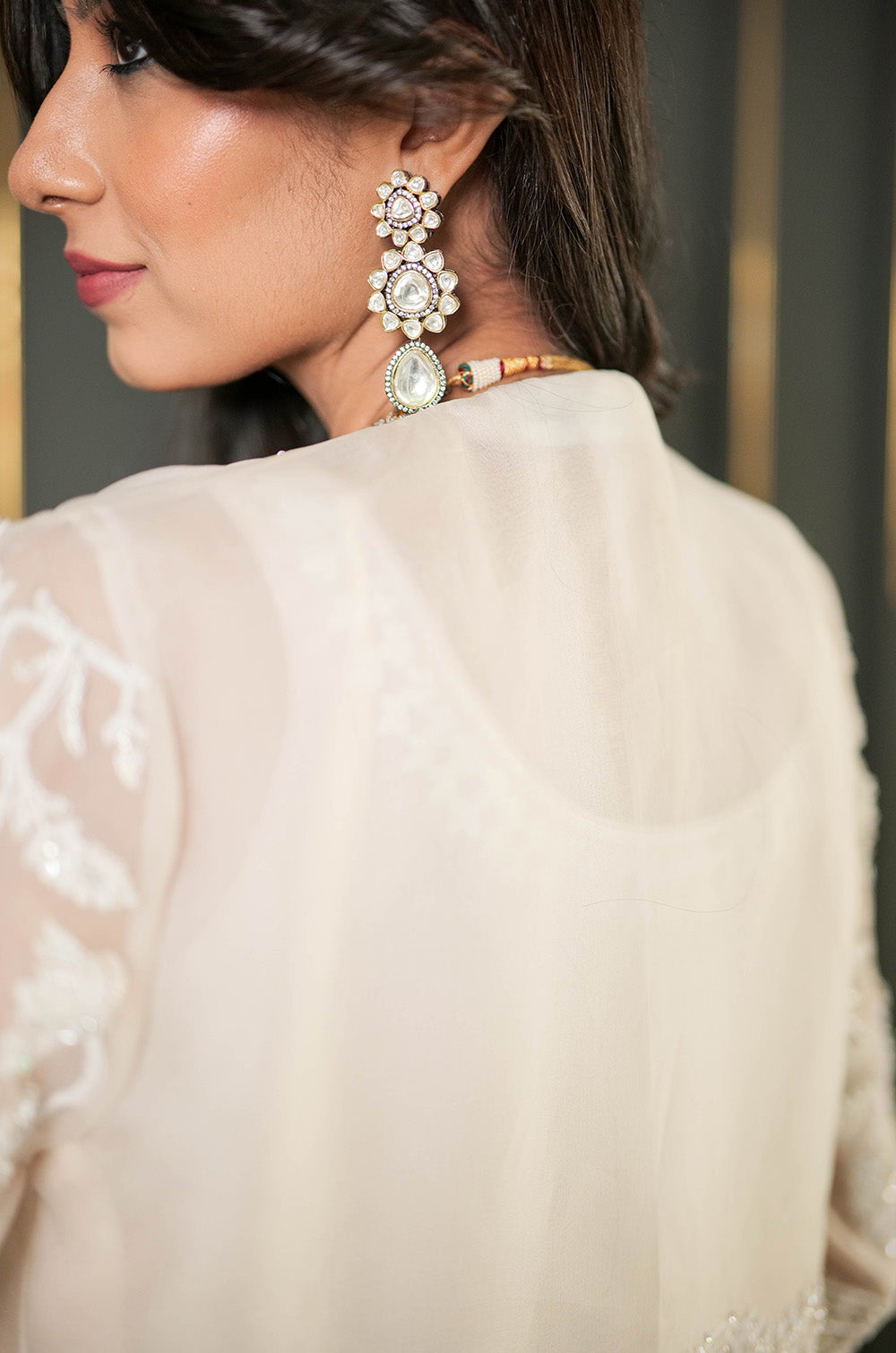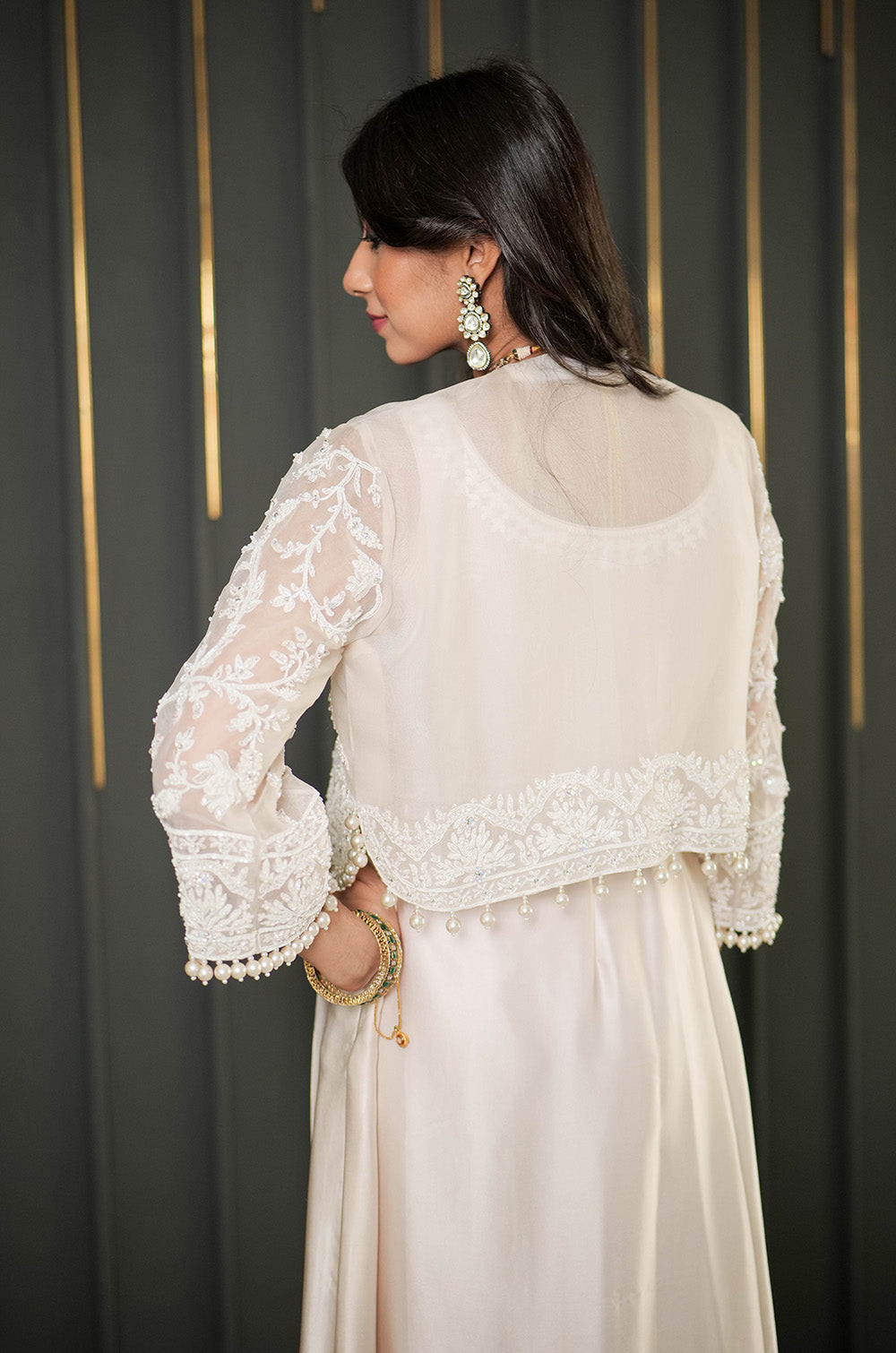 A captivating fusion of sophistication. Beautiful pure organza cropped jacket in ivory color with intricate hand work all over in...