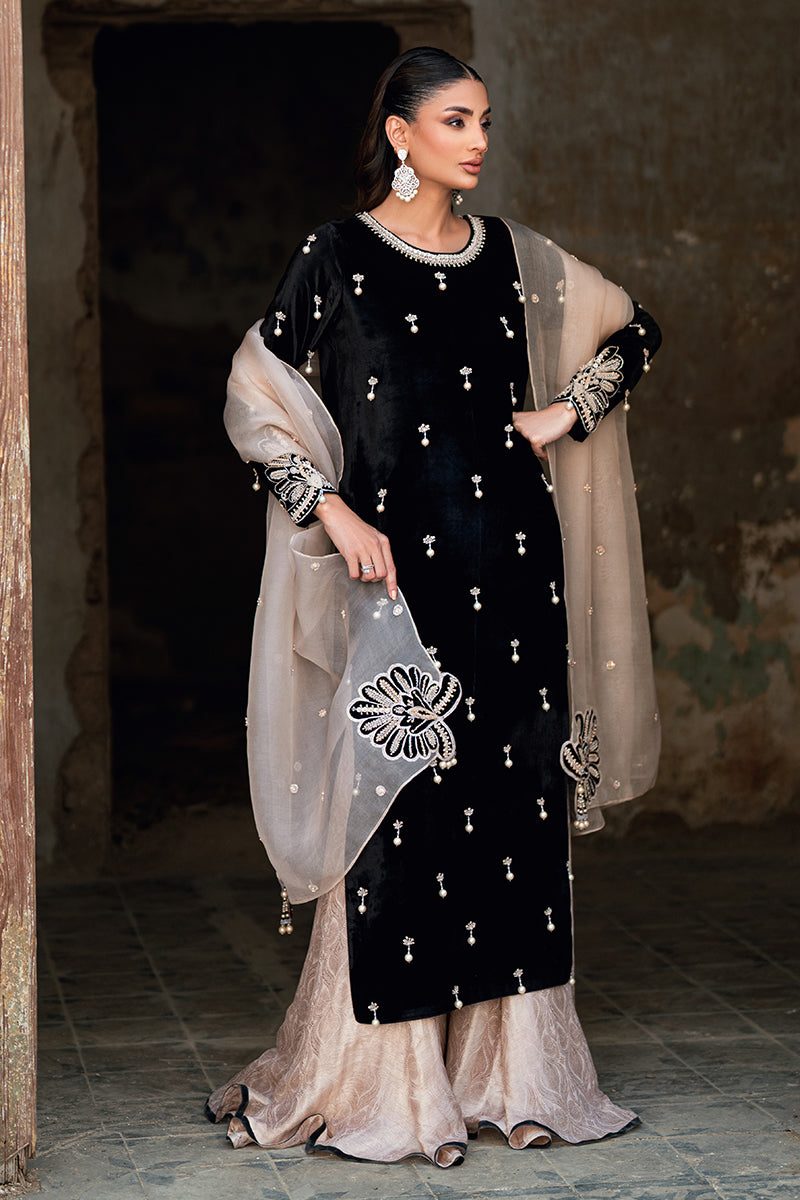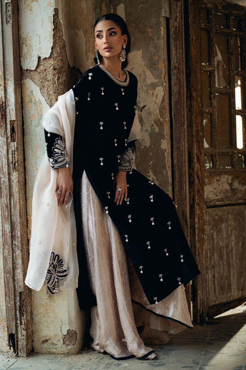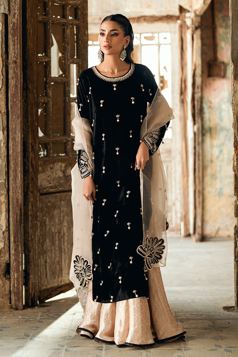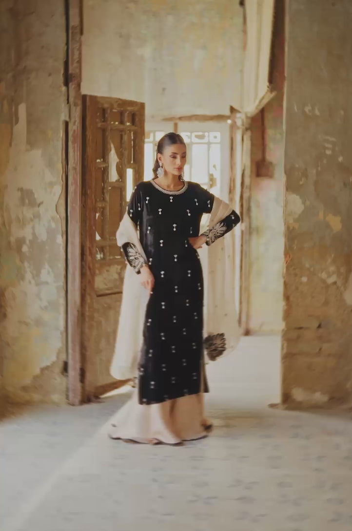 Stunning black velvet dress adorned with intricate gold embroidery, paired with a flowing cream dupatta featuring beautiful black floral motifs. The outfit is complemented by cream-colored pants with black detailing, creating a striking contrast against the rustic, worn-out hallway backdrop. Perfect for a formal or festive occasion .