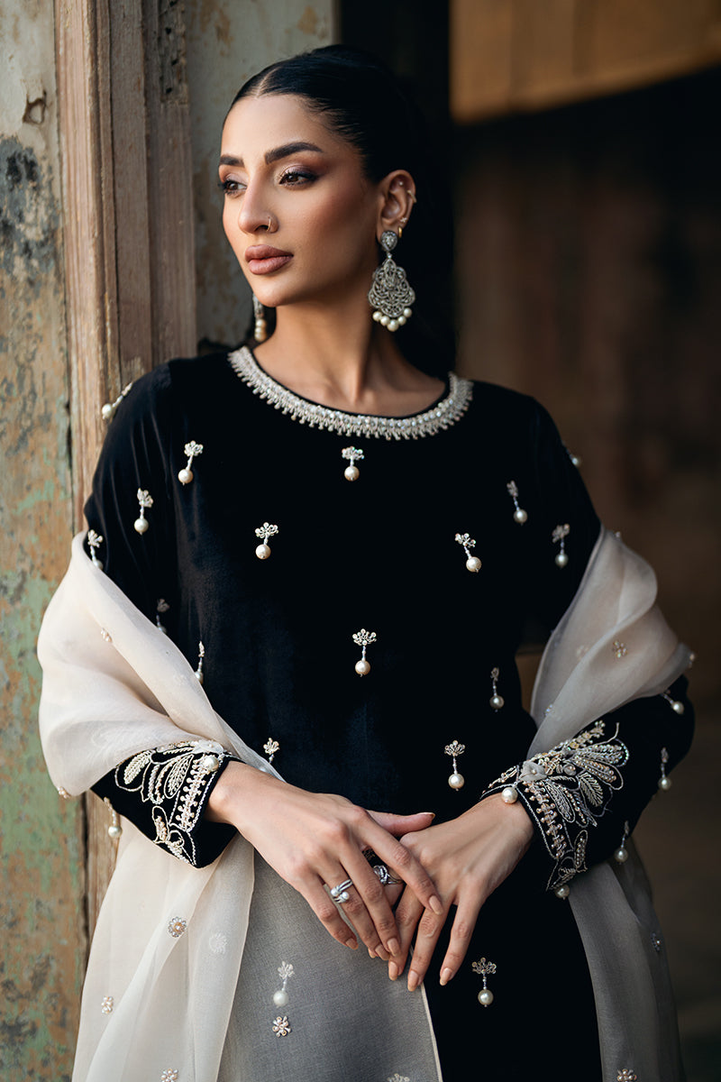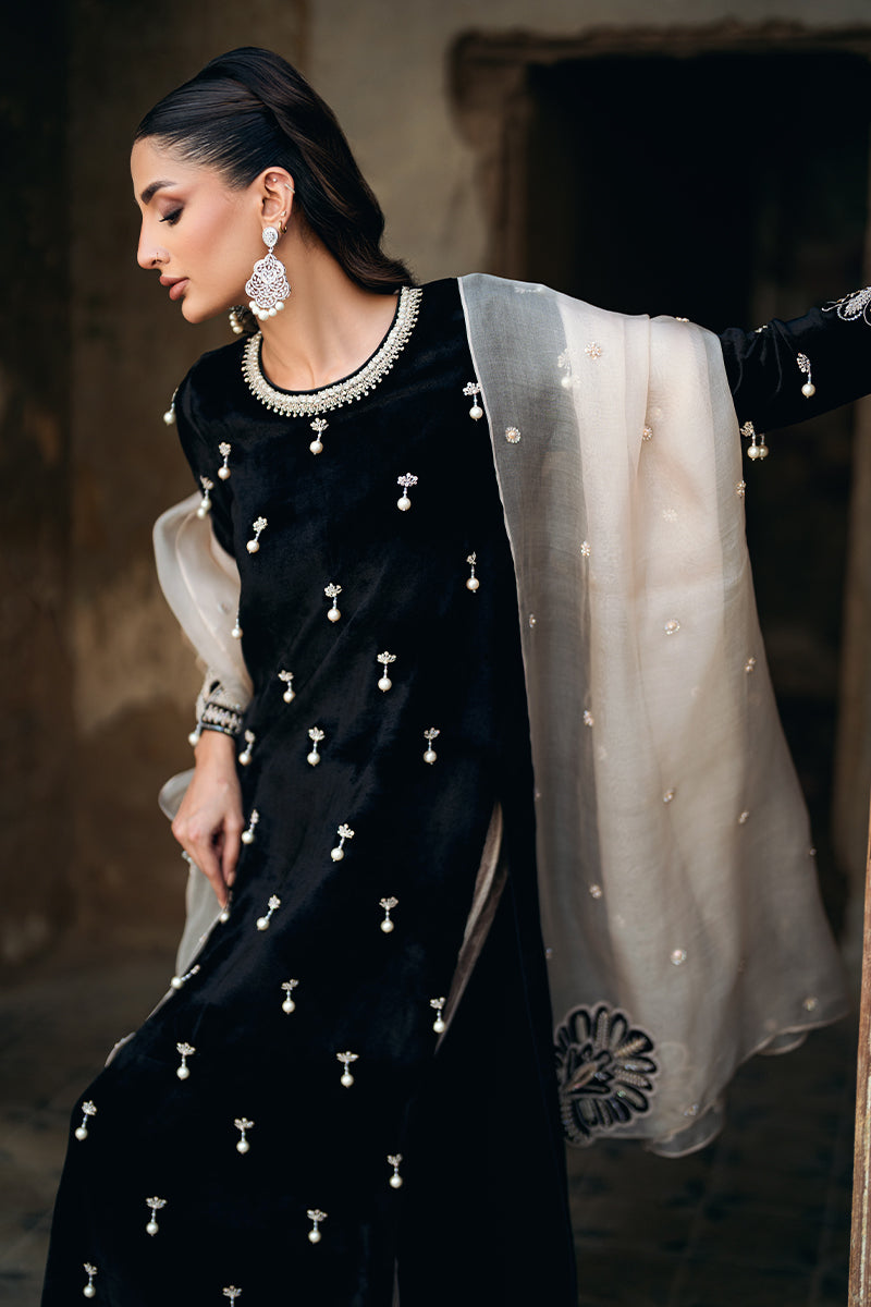 Stunning black velvet dress adorned with intricate gold embroidery, paired with a flowing cream dupatta featuring beautiful black floral motifs....