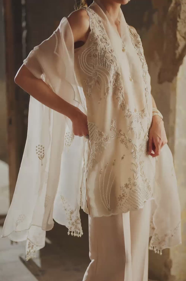 Ivory beige sleeveless organza shirt with textured detailing, paired with organza dupatta featuring beautiful embroidery details and scalloped edges. Complemented by ivory beige pants with aari embroidery and hand embellishment at the bottom, creating a sophisticated and elegant look perfect for formal events .