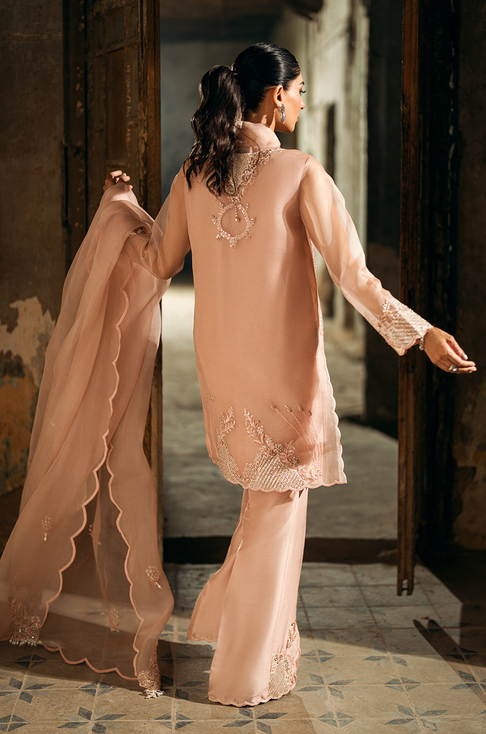 Dusty pink shirt with intricate white floral embroidery, paired with pink bell-bottom pants that flow elegantly with every move. Comes with a stunning flowing pink dupatta featuring delicate scalloped edges and subtle embroidery accents.