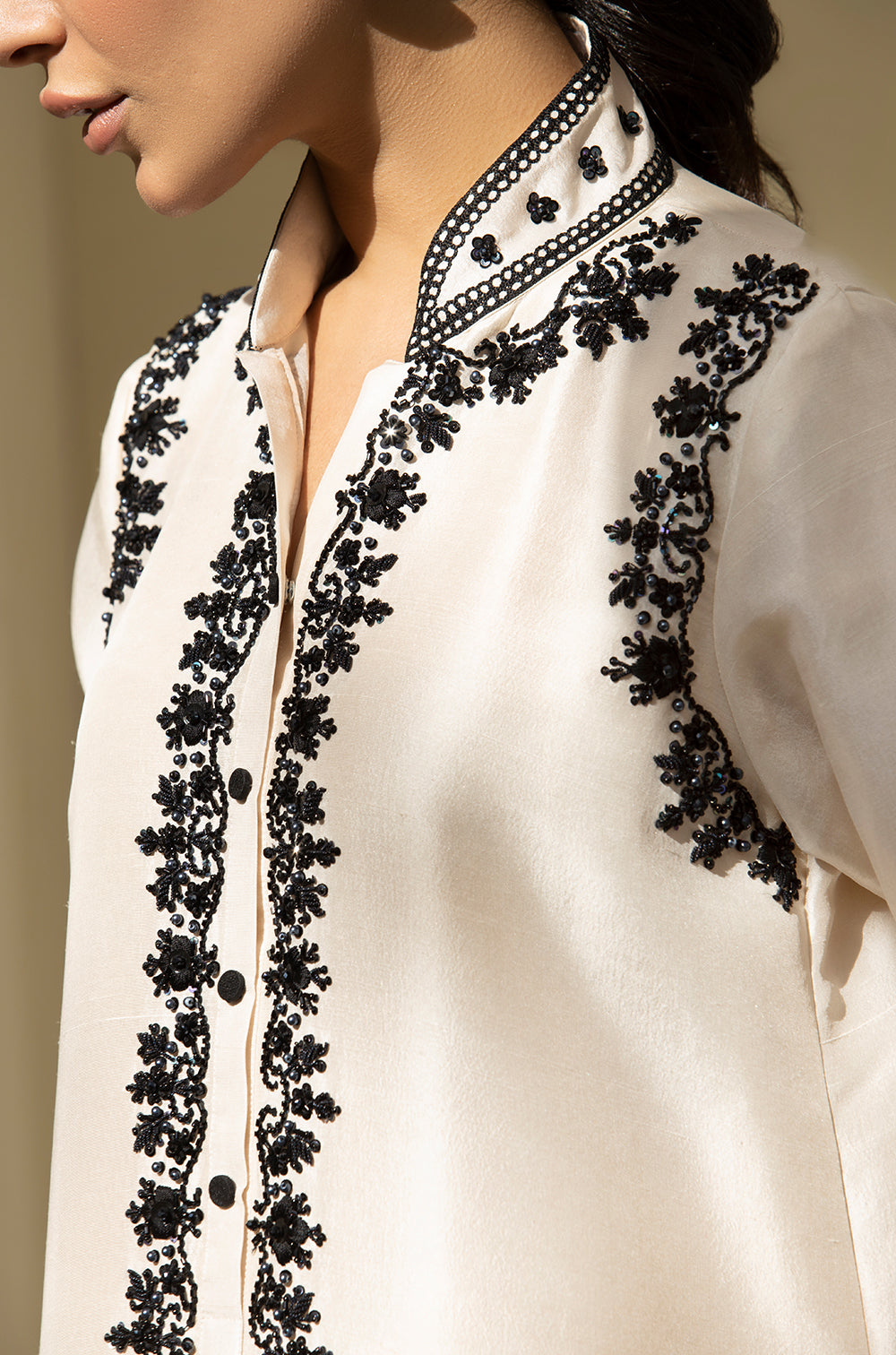Epitomise elegance in this rawsilk ensemble with contrasting black hand embellished details . The Dupatta is finished with laces and bootis … and the look is complete with a slim cut shalwar featuring organza details at the cuff.