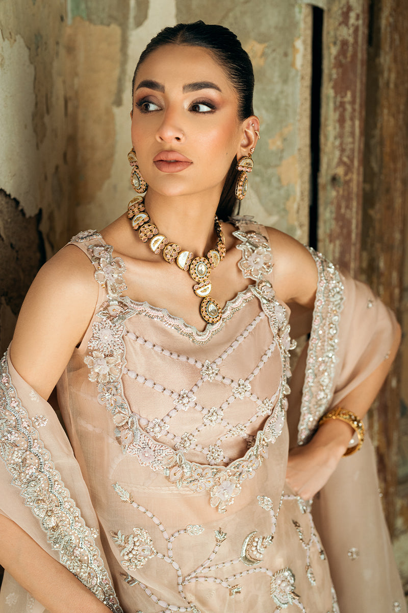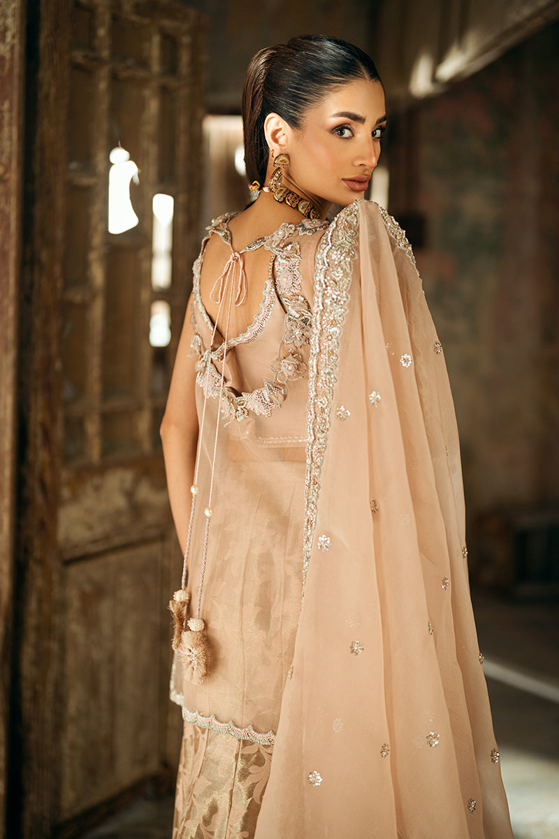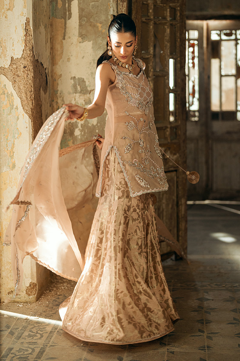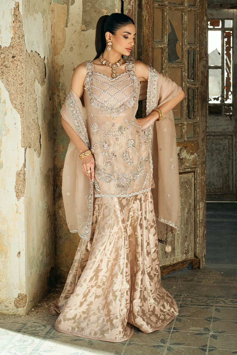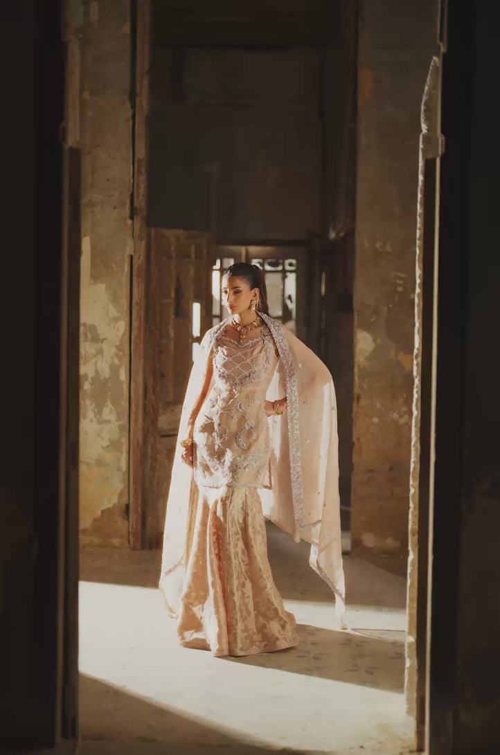Paired with a breathtaking self lame mermaid skirt and a stunning organza dupatta with a heavy one-sided border and delicate detailing all over, this ensemble is truly fit for a bride. The perfect combination of traditional craftsmanship and modern style, this outfit is sure to make you feel like royalty on your nikkah or engagement day.