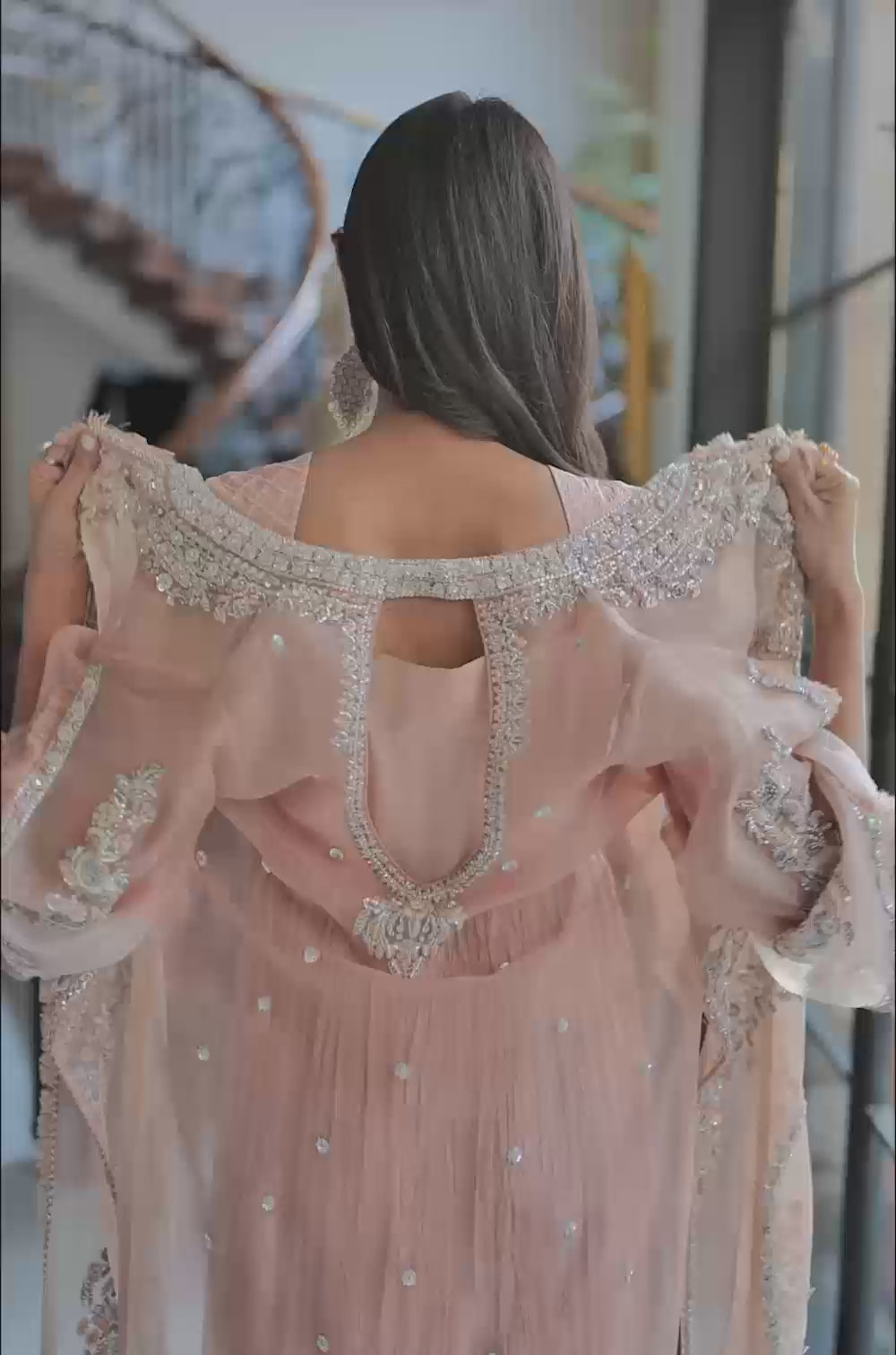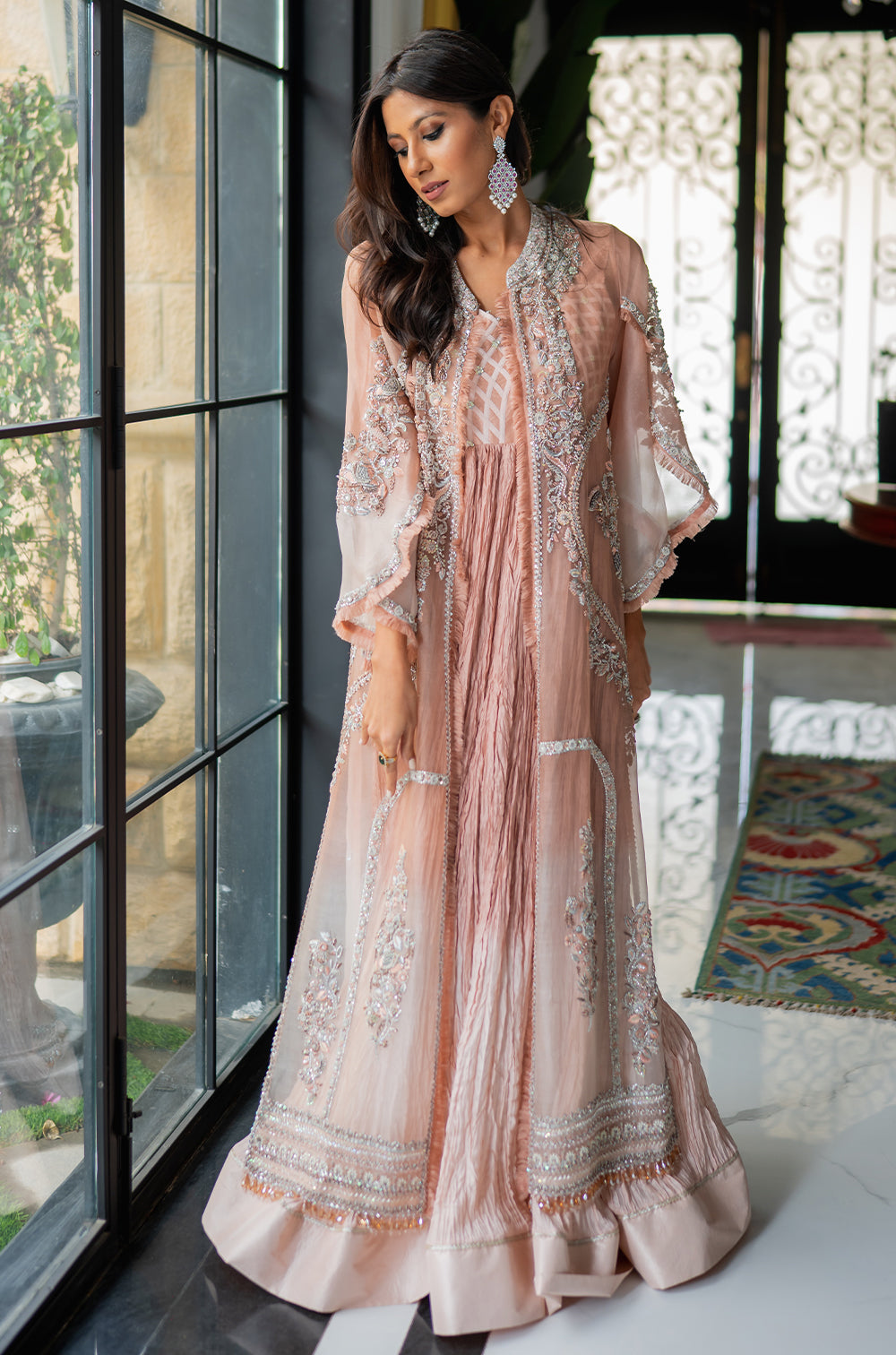 An absolute symbol of grace and elegance— double shaded organza front open style with hues of peach encrusted heavy neckline and geometric work detailed along with our signature over lapped worked sleeves. This is a heavy jacket with crush double shaded peshwaz and fabric manipulated bodice with crystals. Comes with a 4 sided embellished scalloped dupatta with heavy worked corners.