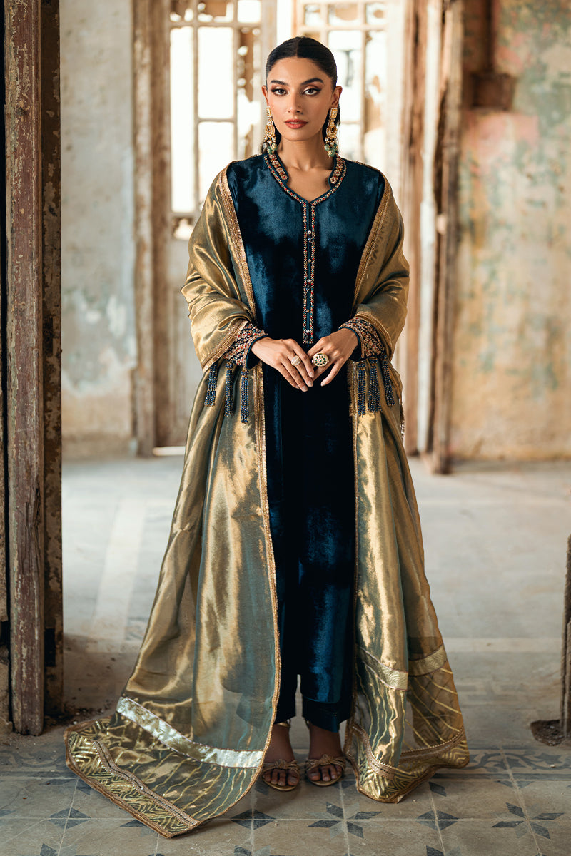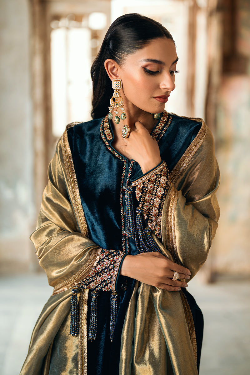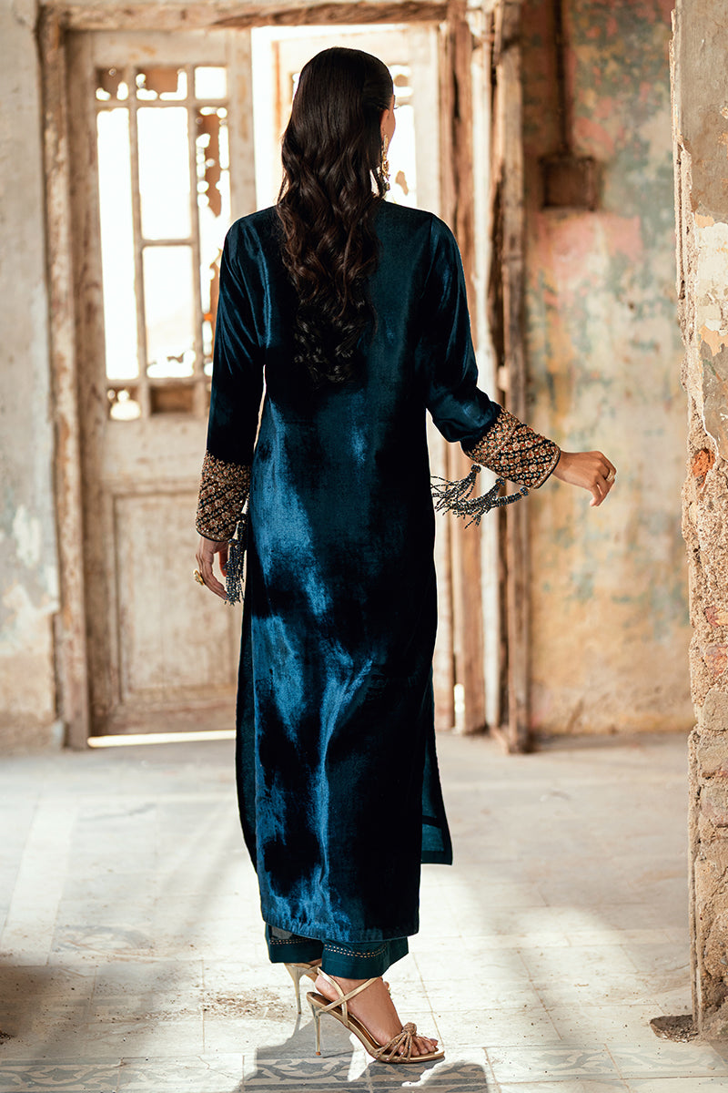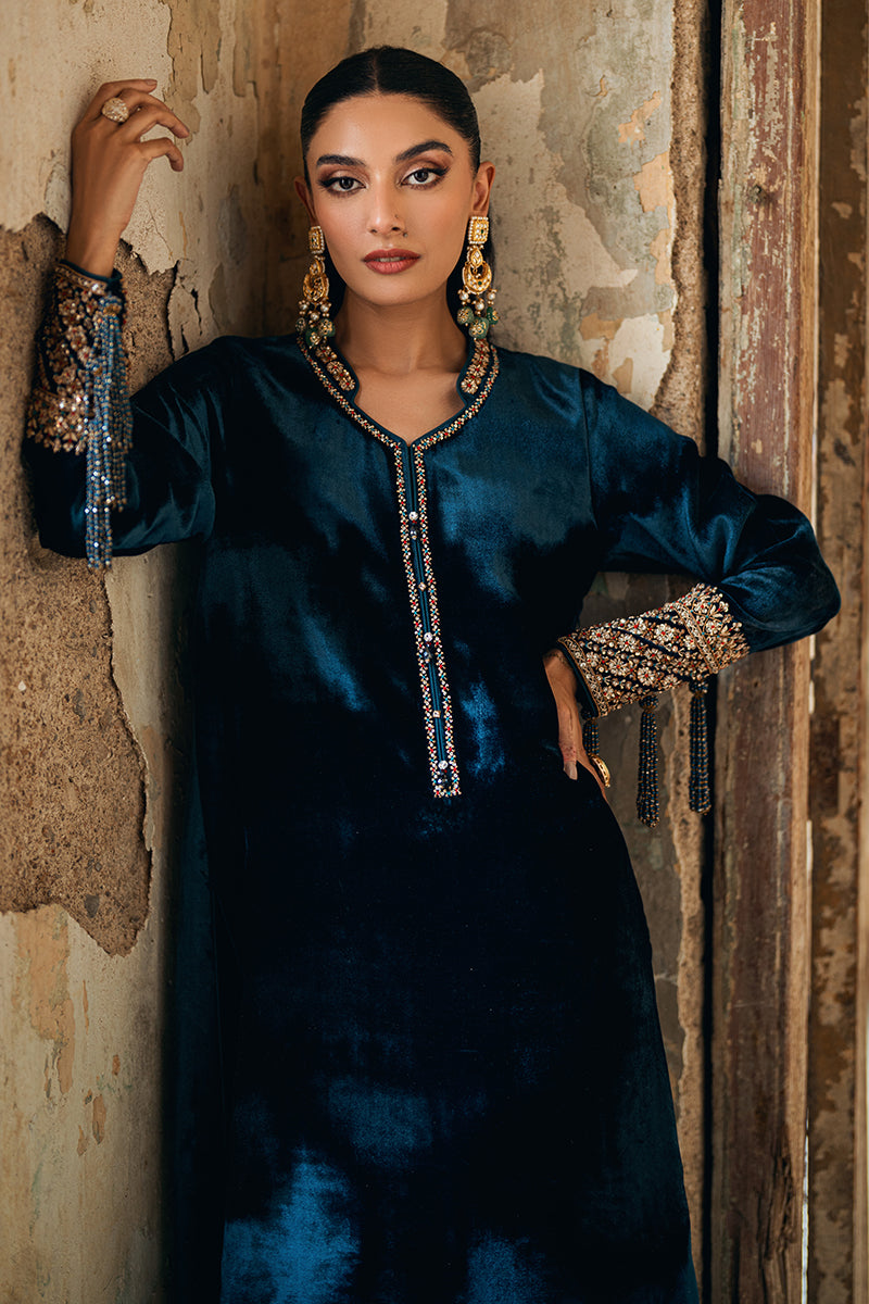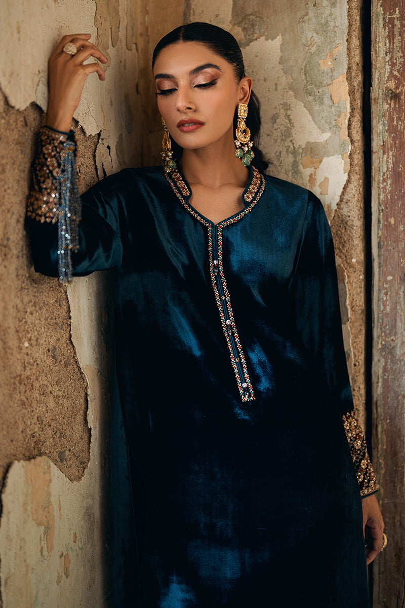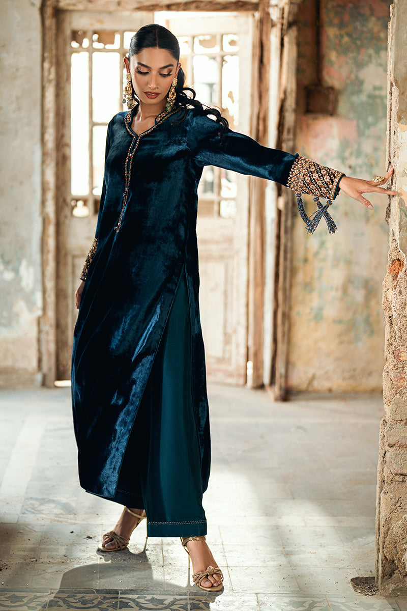 Make a stylish statement in this gorgeous teal blue velvet shirt, crafted with beautiful simple collar work detailing. The sleeves feature border cuffs adorned with handmade tassels that add a touch of elegance and sophistication.
