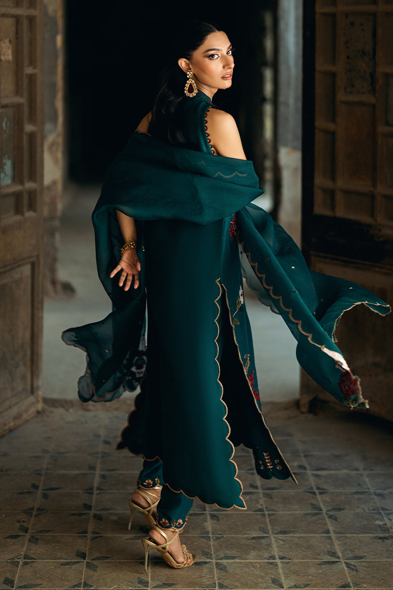 Paired with raw silk izaar that adds a touch of subtlety to the overall look, with delicate chain stitch detailing on the hem that adds a hint of understated charm. With the option to add a dupatta for extra glamour, this ensemble is perfect for formal events, weddings, or special occasions.