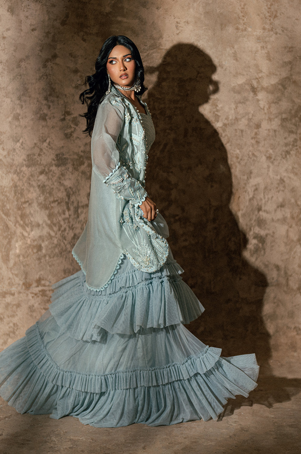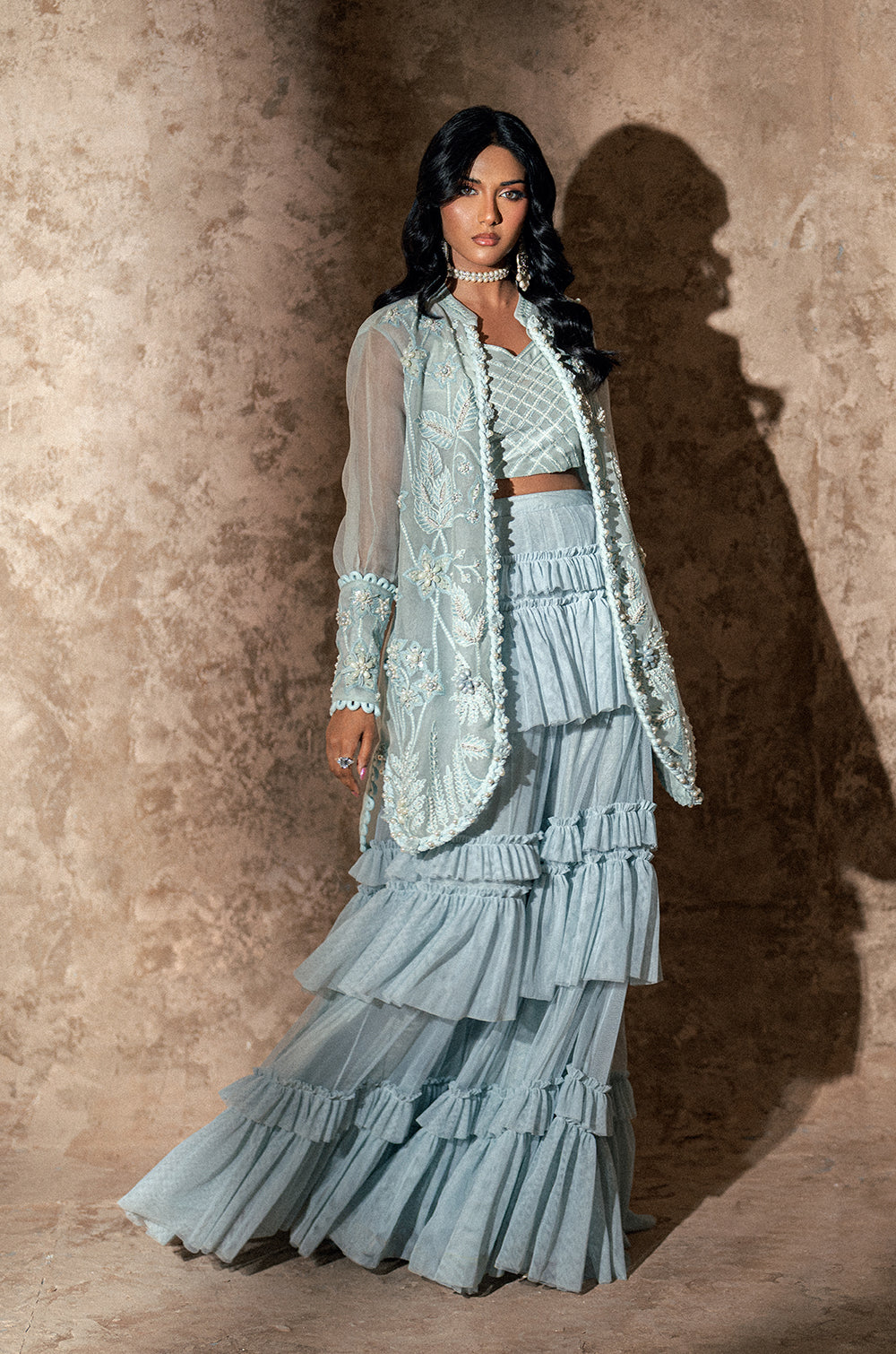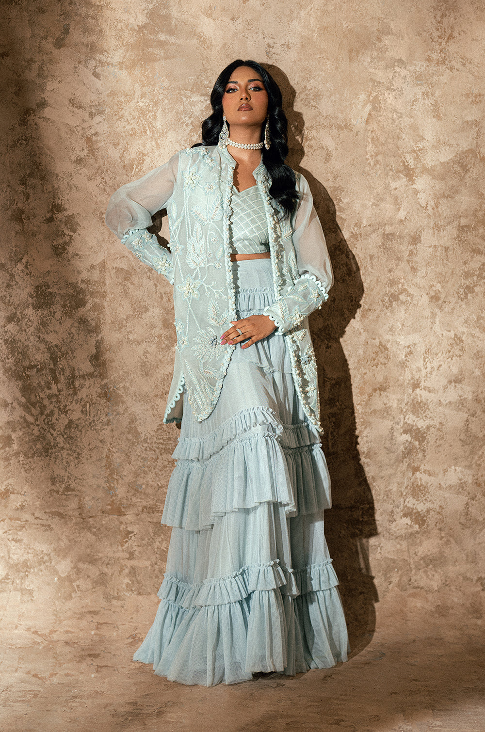 Step into enchantment with this breathtaking powder blue organza jacket, intricately adorned with exquisite work, delicate pearls, and hand-touching embellishments....