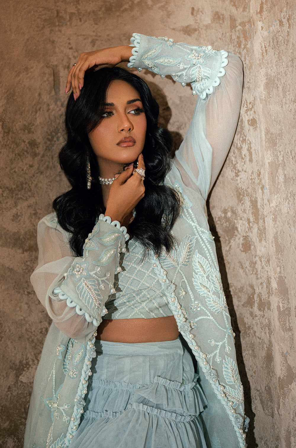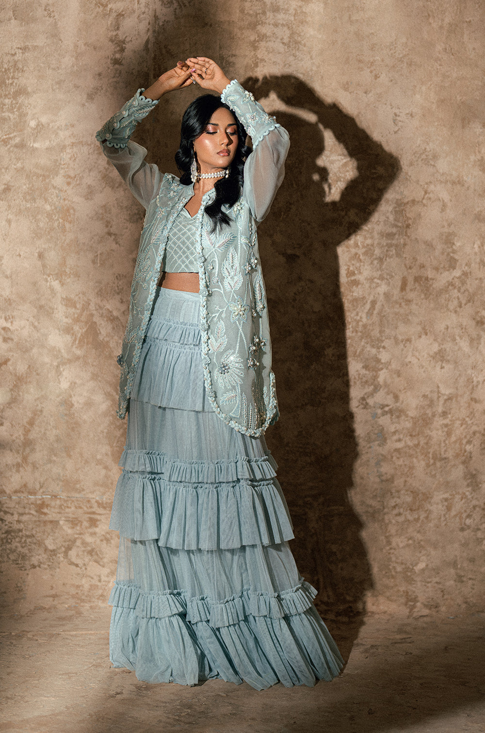 Step into enchantment with this breathtaking powder blue organza jacket, intricately adorned with exquisite work, delicate pearls, and hand-touching embellishments. A true masterpiece of craftsmanship.