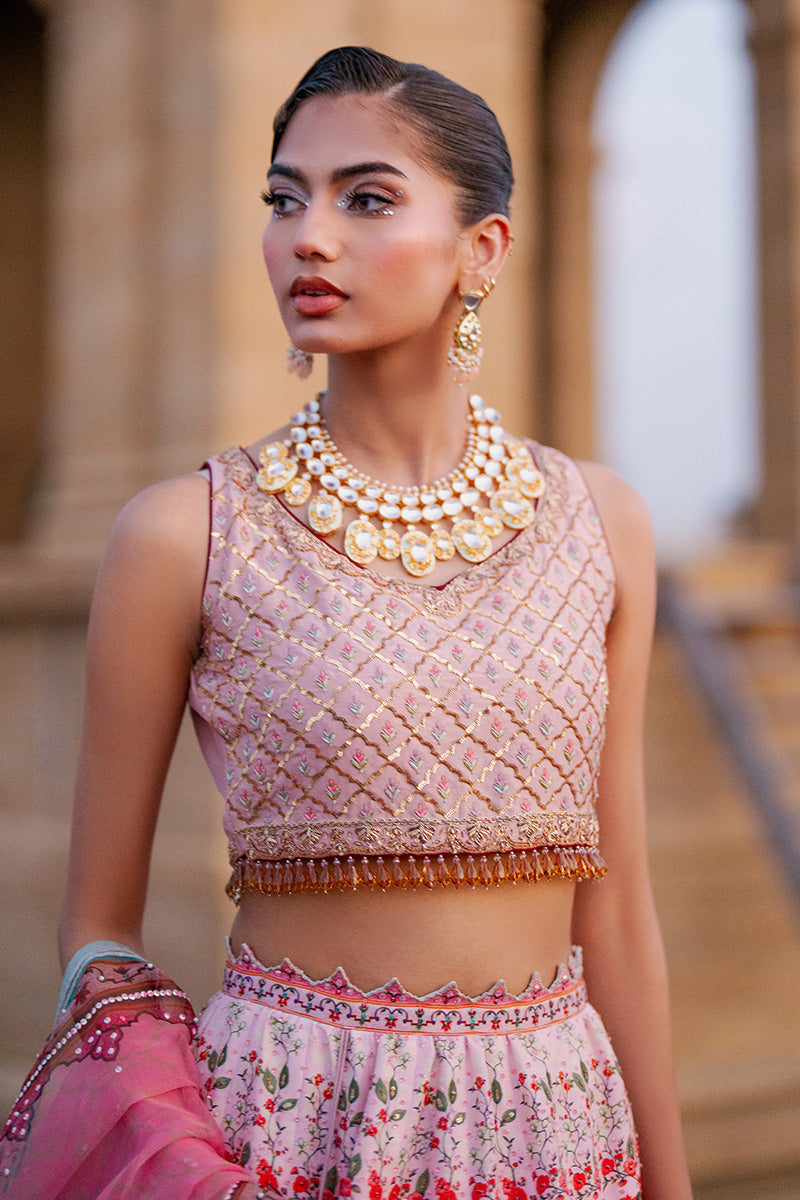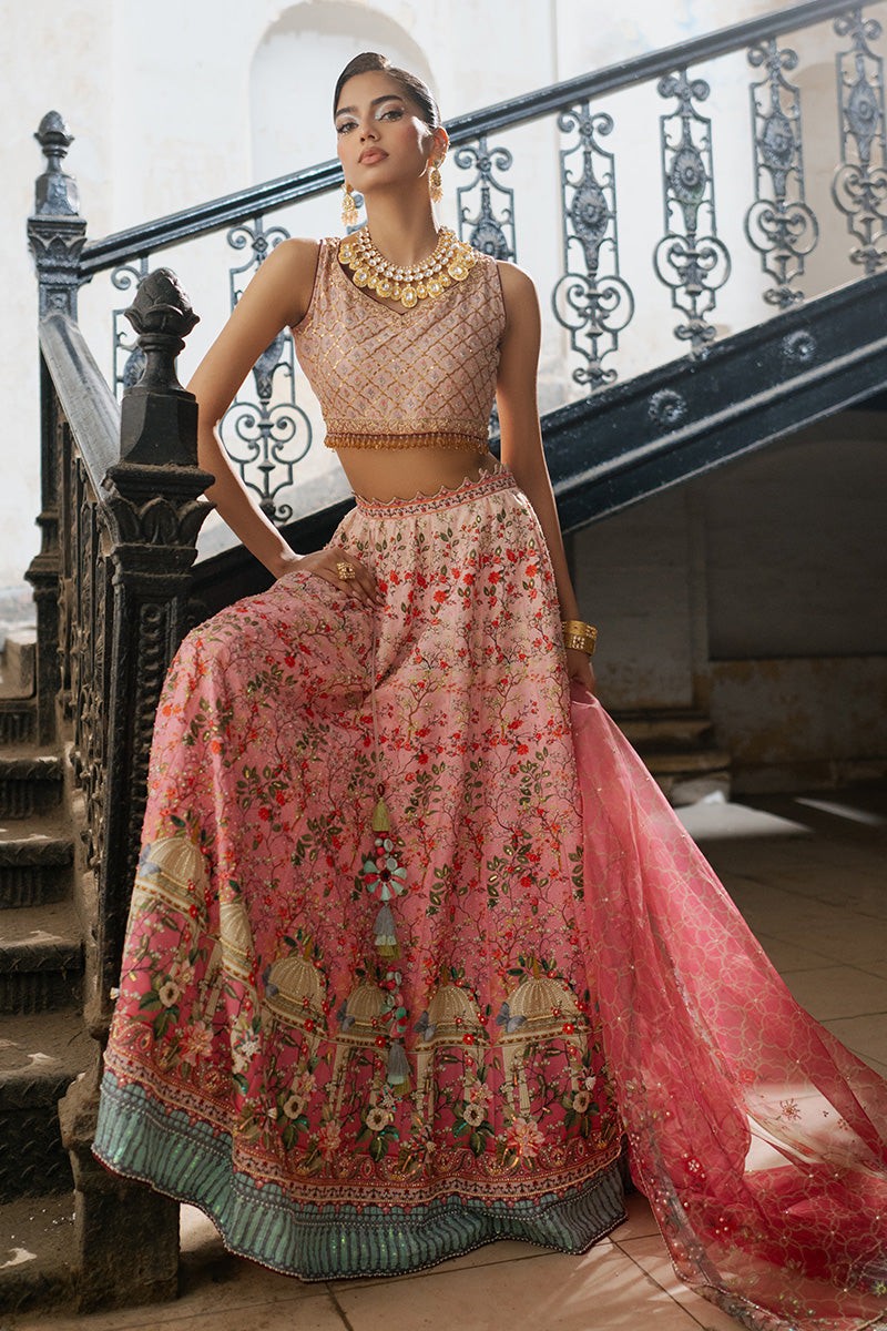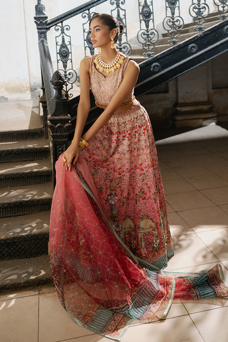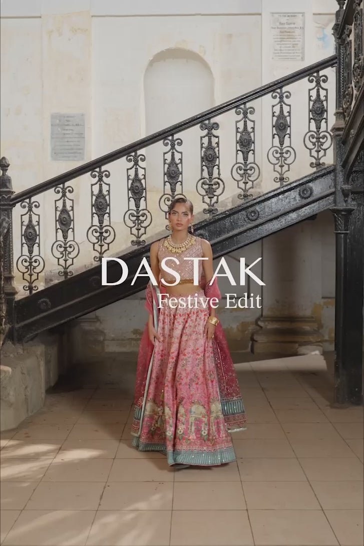 Lehenga choli is inspired by historic architecture. This majestic silk lehanga features print in florals, monuments and arches ,beautifully enhanced with sequin details. Paired with an organza duppata matching the print and work details.