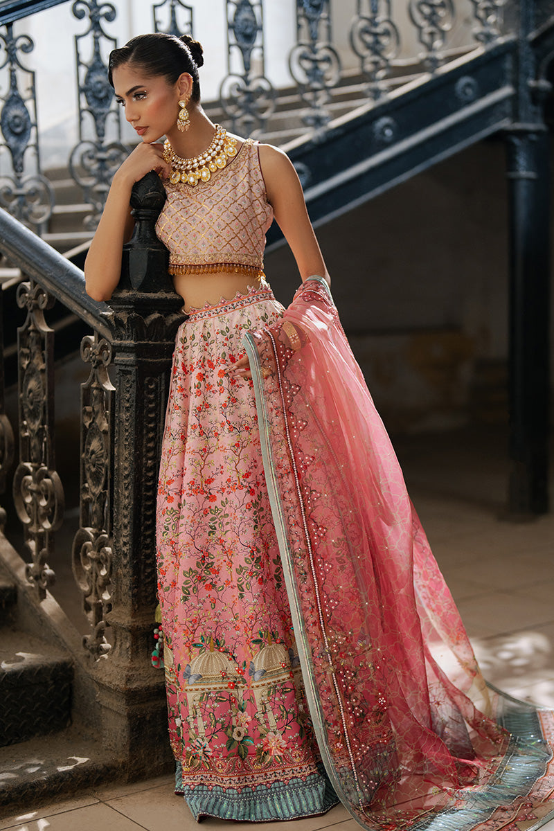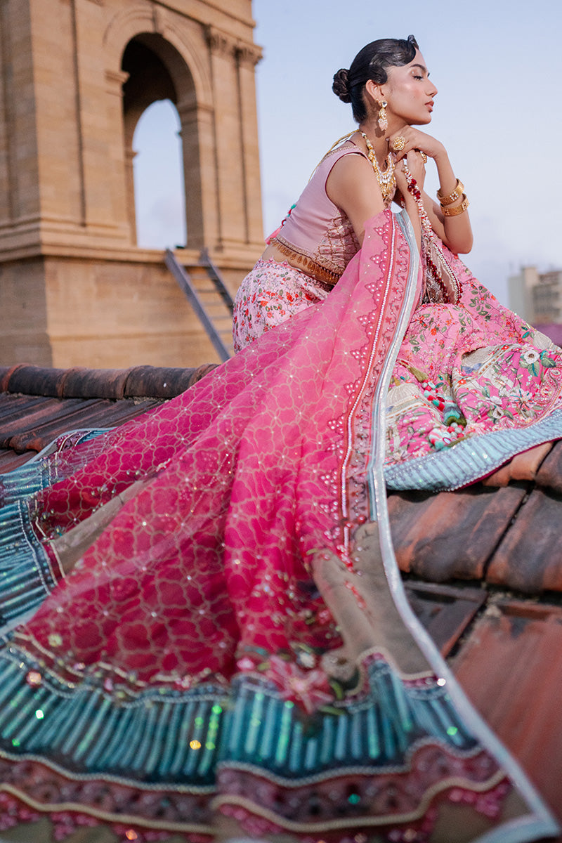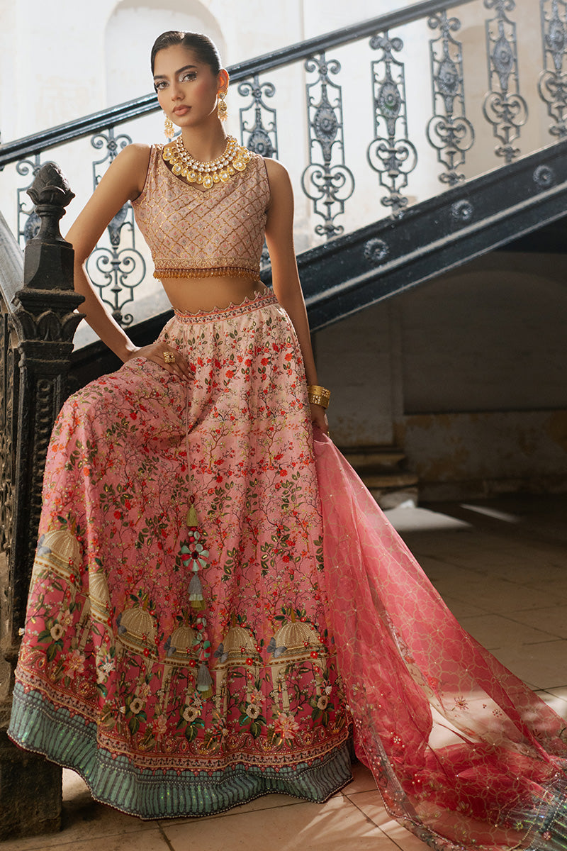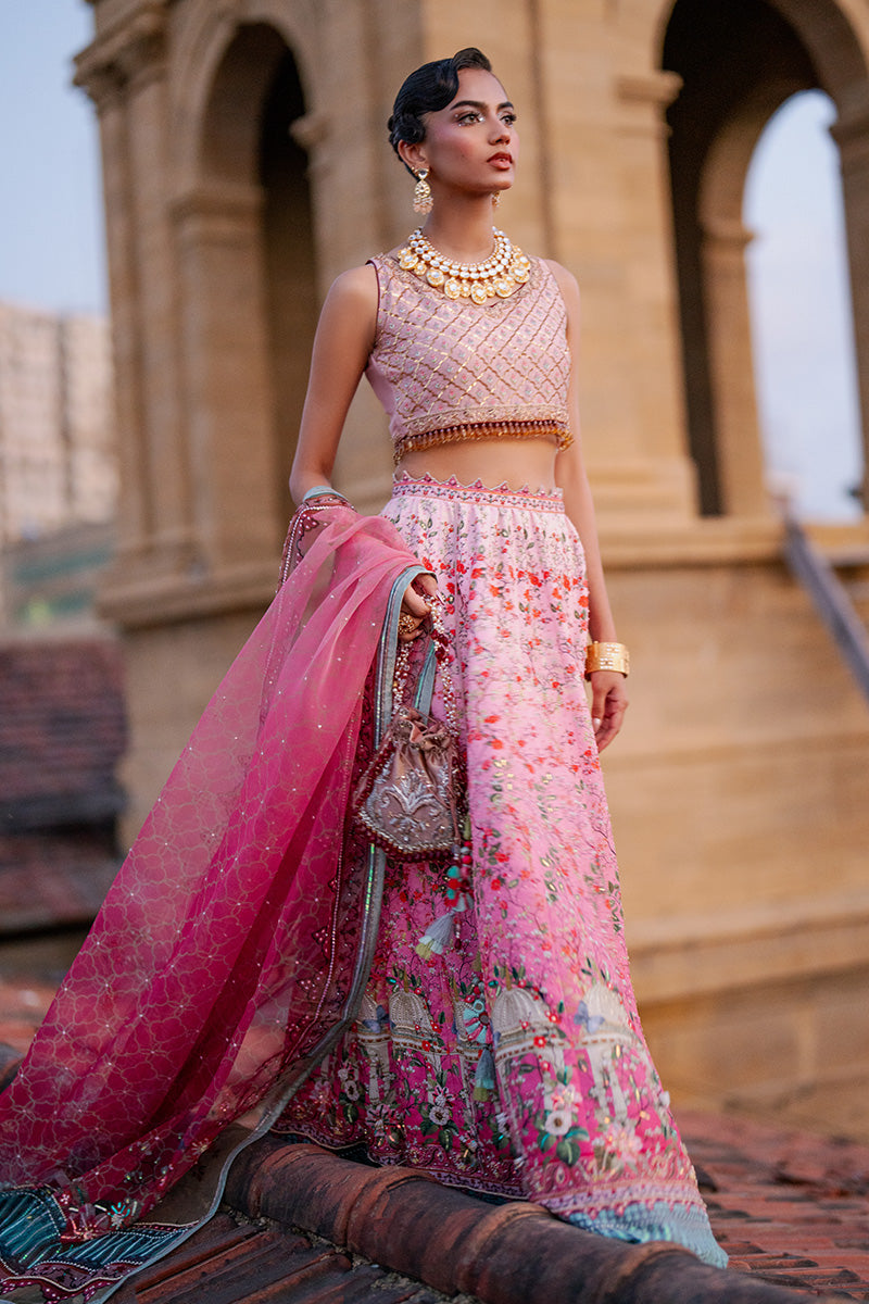 Lehenga choli is inspired by historic architecture. This majestic silk lehanga features print in florals, monuments and arches ,beautifully enhanced with sequin details. Paired with an organza duppata matching the print and work details.
